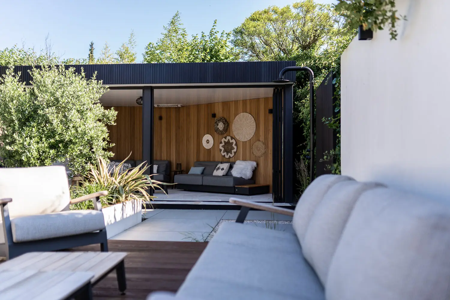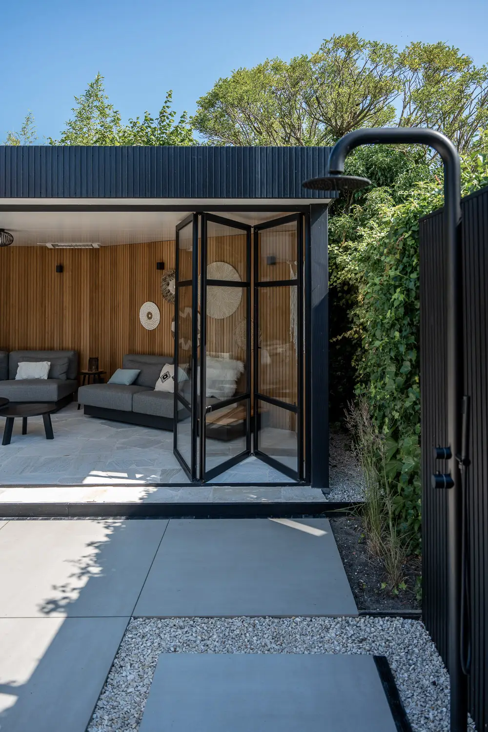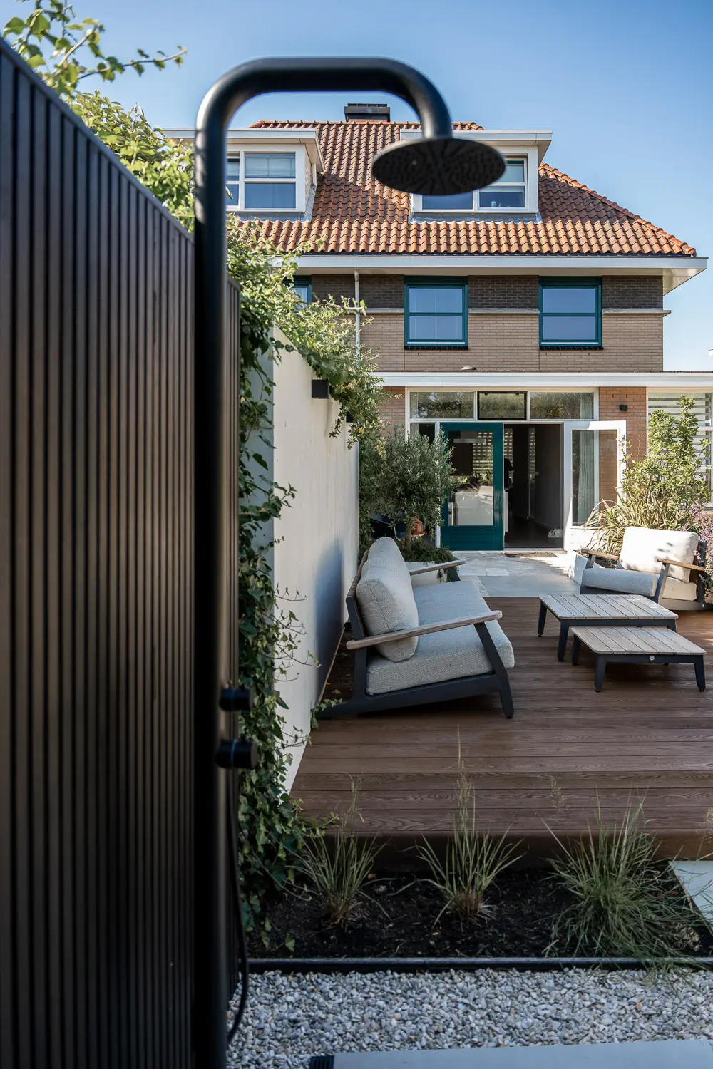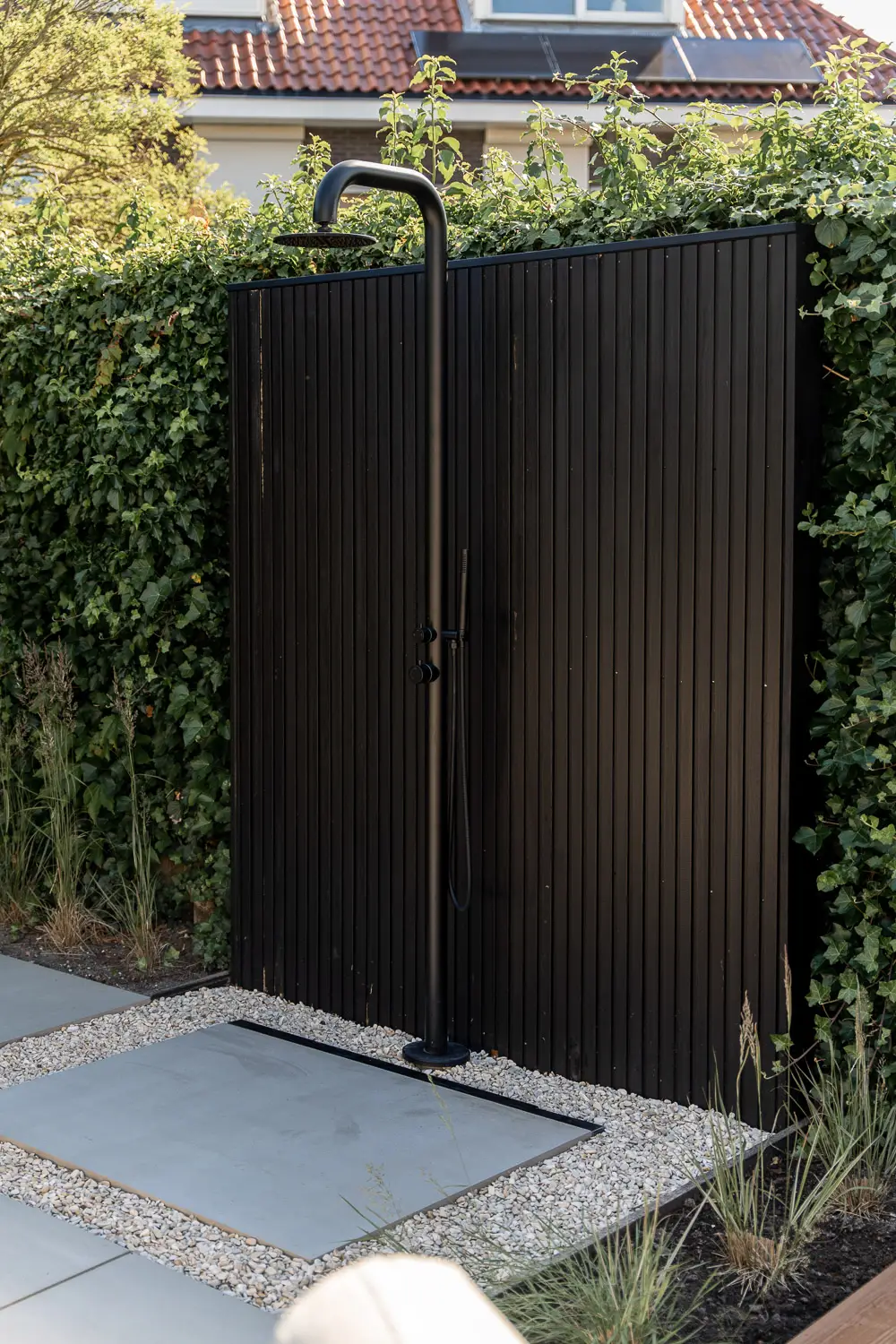 Tenslotte is er aandacht voor de praktische luxe: een stijlvolle buitendouche, een plek om af te koelen, een verfrissing in de werkelijkheid van de tuin — een ervaring die uitnodigt tot rust en zintuiglijke beleving.