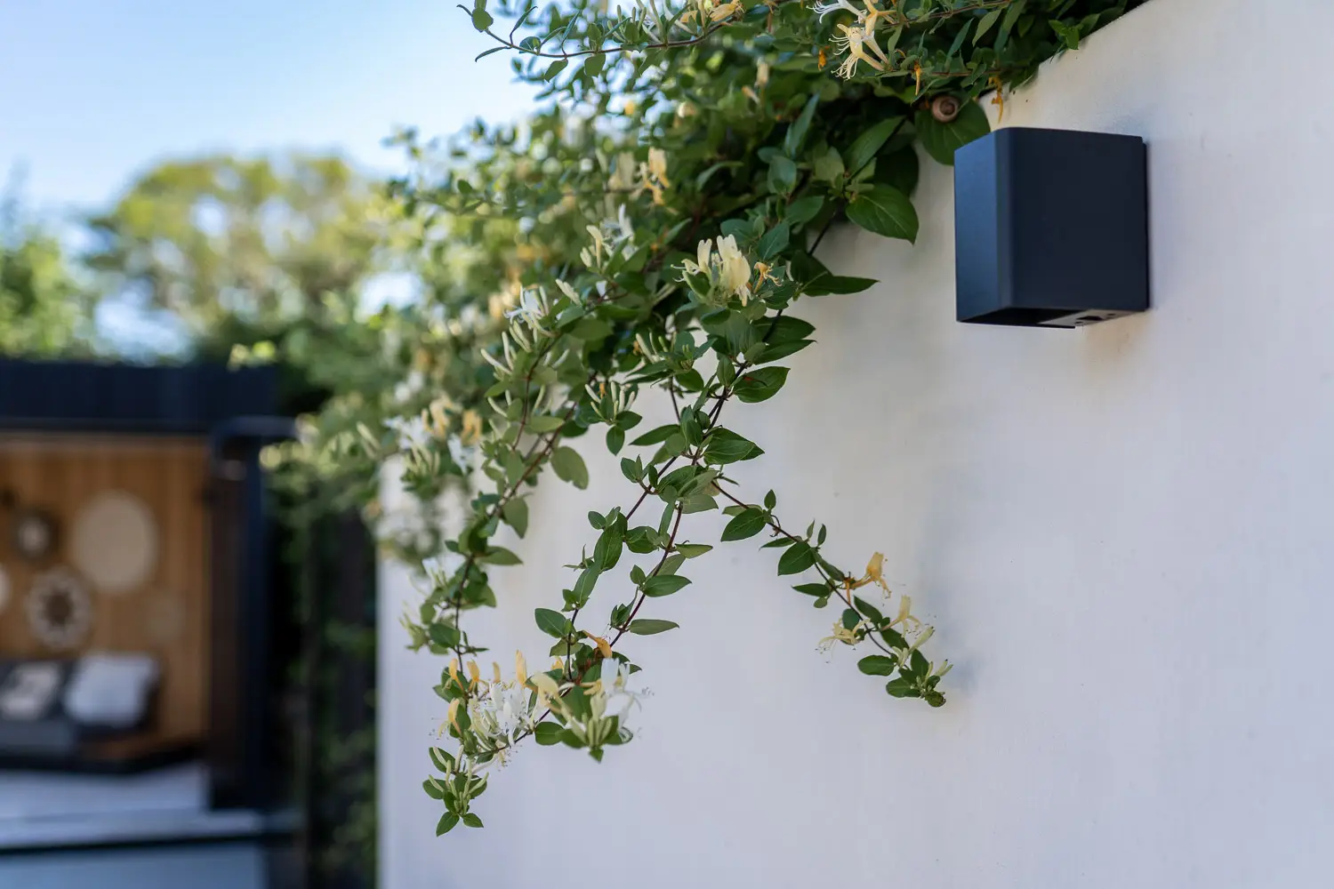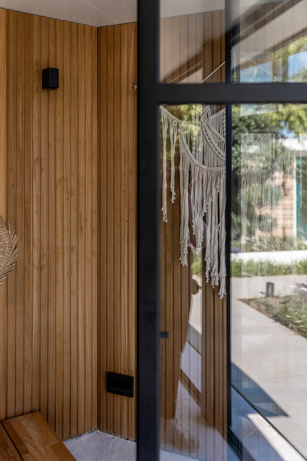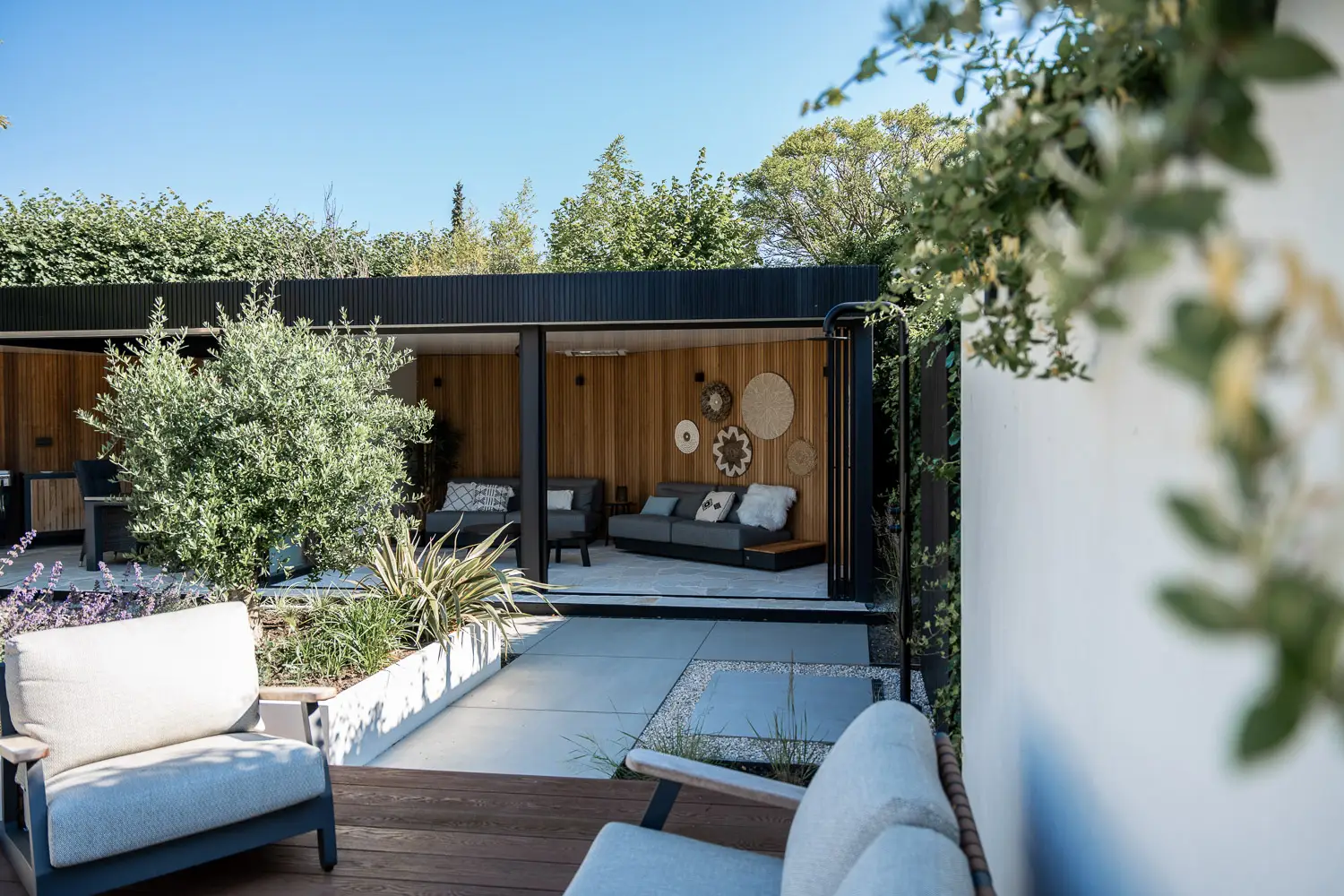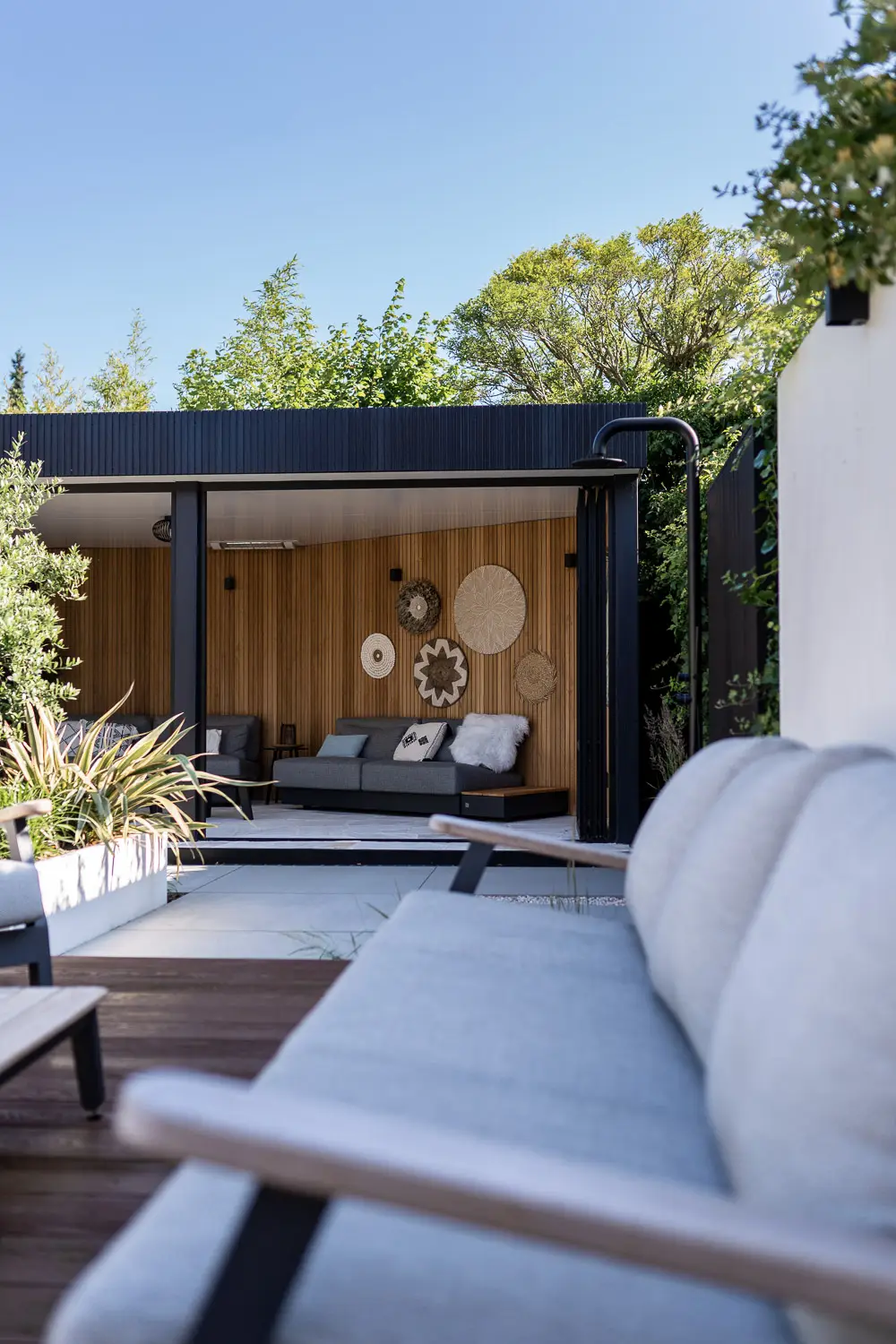 Tenslotte is er aandacht voor de praktische luxe: een stijlvolle buitendouche, een plek om af te koelen, een verfrissing in de werkelijkheid van de tuin — een ervaring die uitnodigt tot rust en zintuiglijke beleving.