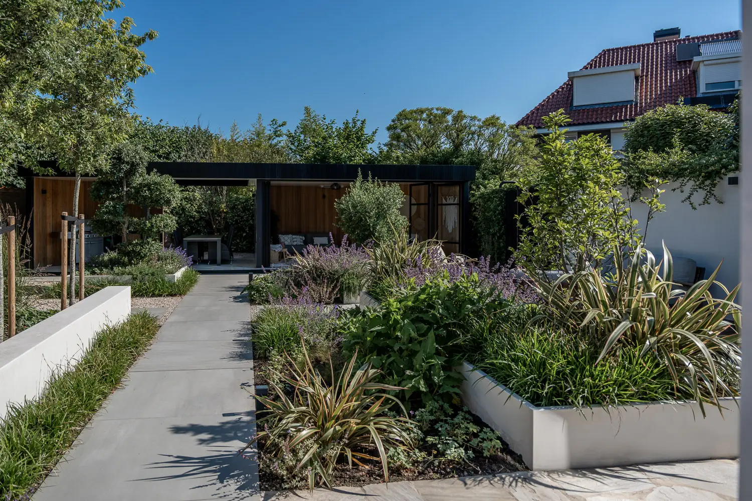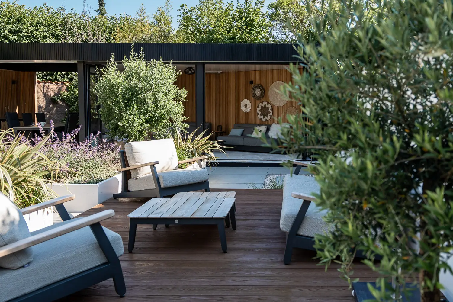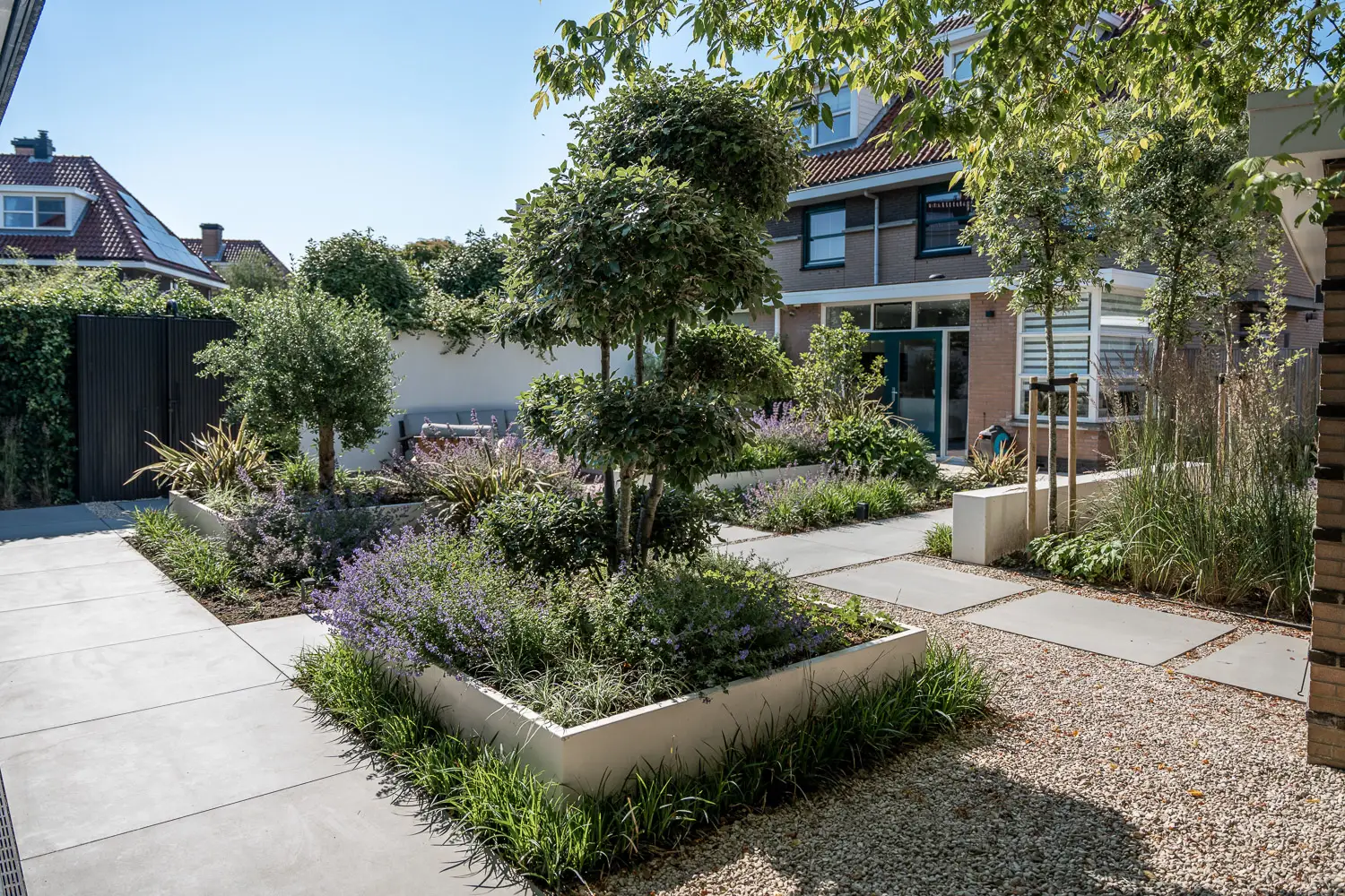 Op beplantingsgebied is gekozen voor contrast tussen vorm en spontaniteit. Een vormgesnoeide steeneik voegt structuur en karakter toe; een olijfboom geeft mediterrane flair. Daartussen bloeit een wilde rijkbloeiende vaste beplanting, wat zorgt voor kleur, geur en leven, zonder dat het overdadig wordt.