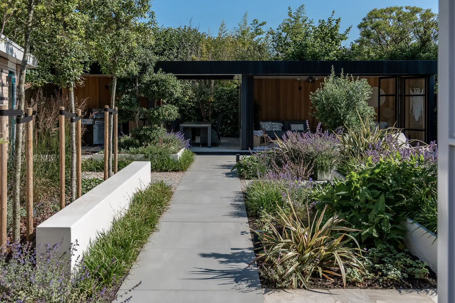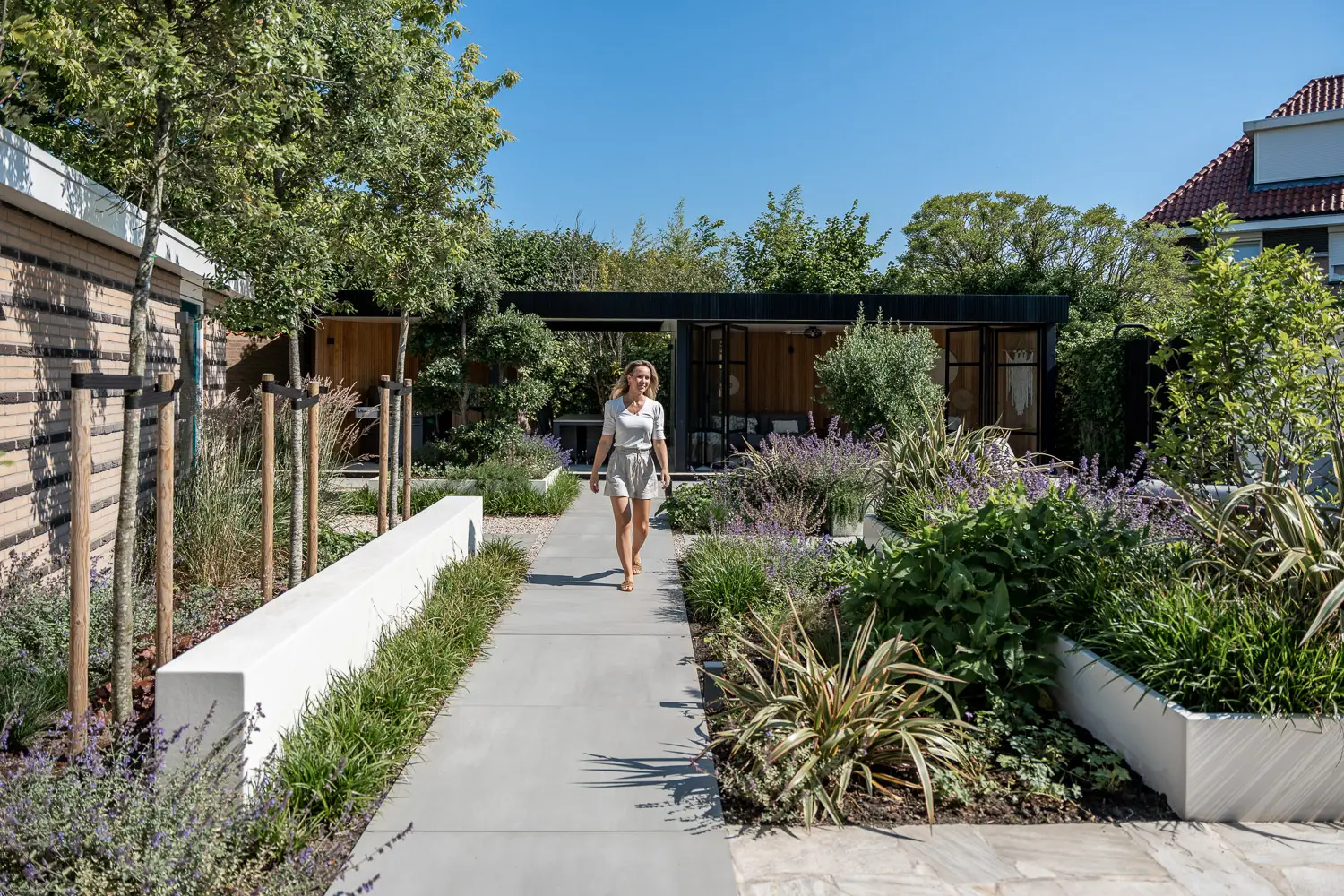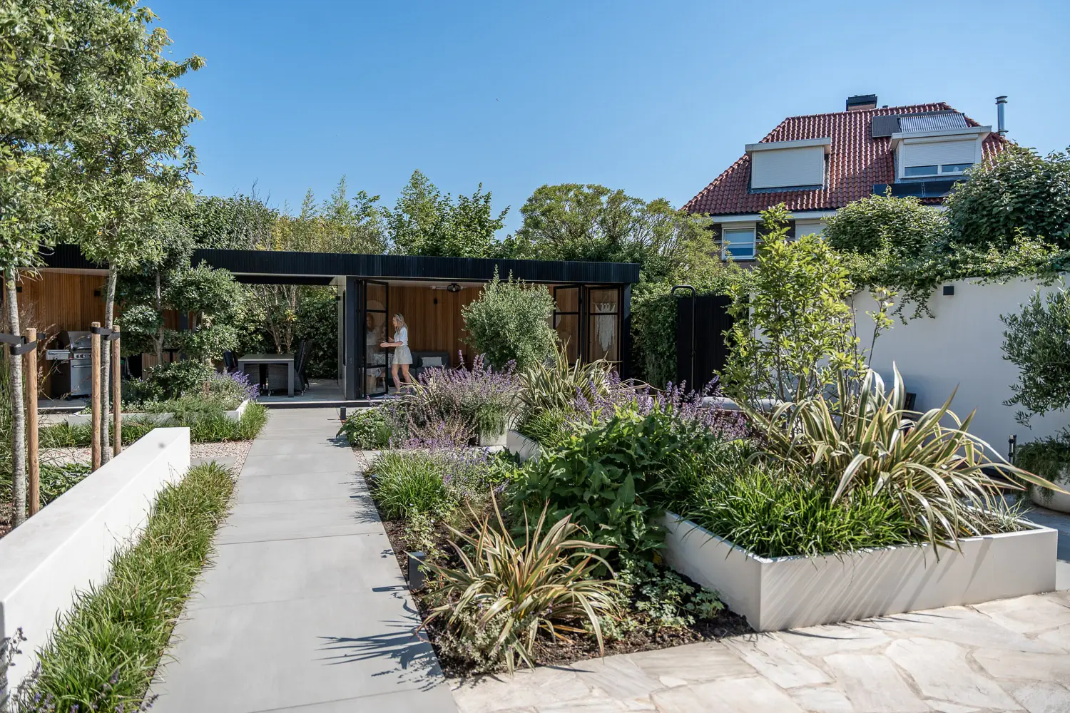 Op beplantingsgebied is gekozen voor contrast tussen vorm en spontaniteit. Een vormgesnoeide steeneik voegt structuur en karakter toe; een olijfboom geeft mediterrane flair. Daartussen bloeit een wilde rijkbloeiende vaste beplanting, wat zorgt voor kleur, geur en leven, zonder dat het overdadig wordt.
