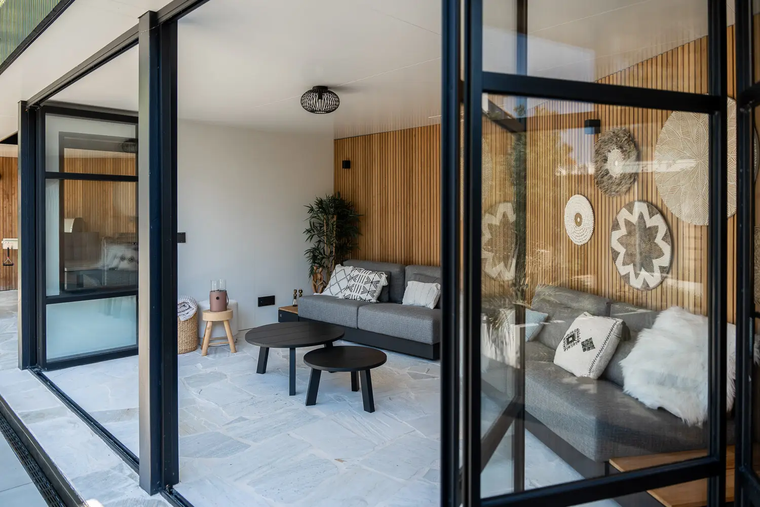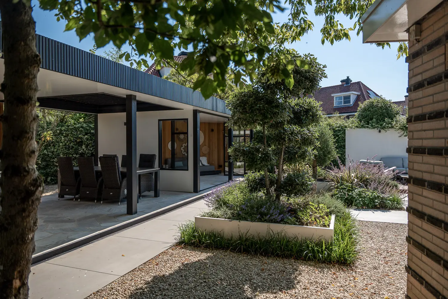 Een bijzondere maatwerk tuinkamer, strategisch in een hoek van de tuin, vormt het buitenverblijf. De tuinkamer is uitgevoerd met een elegant Rhombus profiel, wat zorgt voor subtiele schaduwval én een strakke, moderne uitstraling. Om wanden flexibel te maken en de beleving binnen/buiten te vergroten, zijn Van Bach vouwwanden toegepast: zo kan de ruimte volledig open of juist afgesloten worden, afhankelijk van het weer en de wens.
