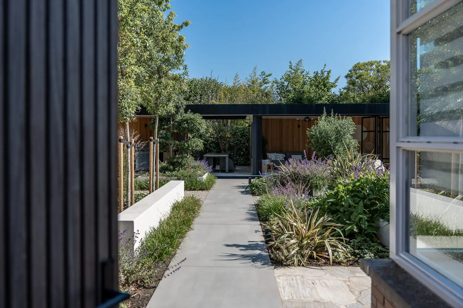 De beleving in de tuin wordt versterkt door materialen die kwaliteit uitstralen: grote keramische tegels naast robuuste flagstones, die samen voor rust, stabiliteit en hoogwaardige afwerking zorgen. In de avonduren speelt Inlite verlichtingeen sleutelrol – het accentueert vormen, groendetails en creëert sfeer.