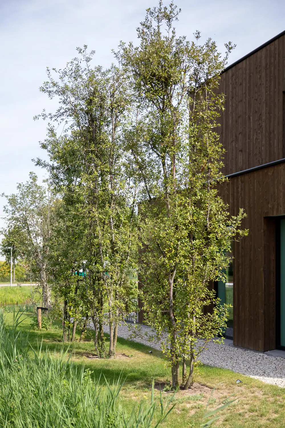 Het groen speelt een belangrijke rol in de beleving. Steeneiken en meerstammige steeneiken zijn gebruikt om een krachtige, groenblijvende structuur te creëren. Deze bomen geven de tuin direct body, zorgen voor hoogte en filteren het zicht zonder alles helemaal af te sluiten.