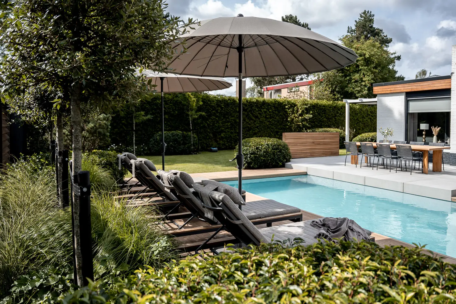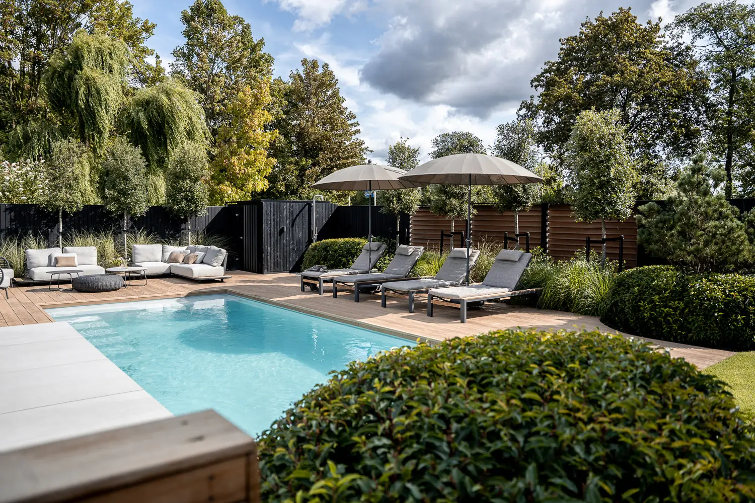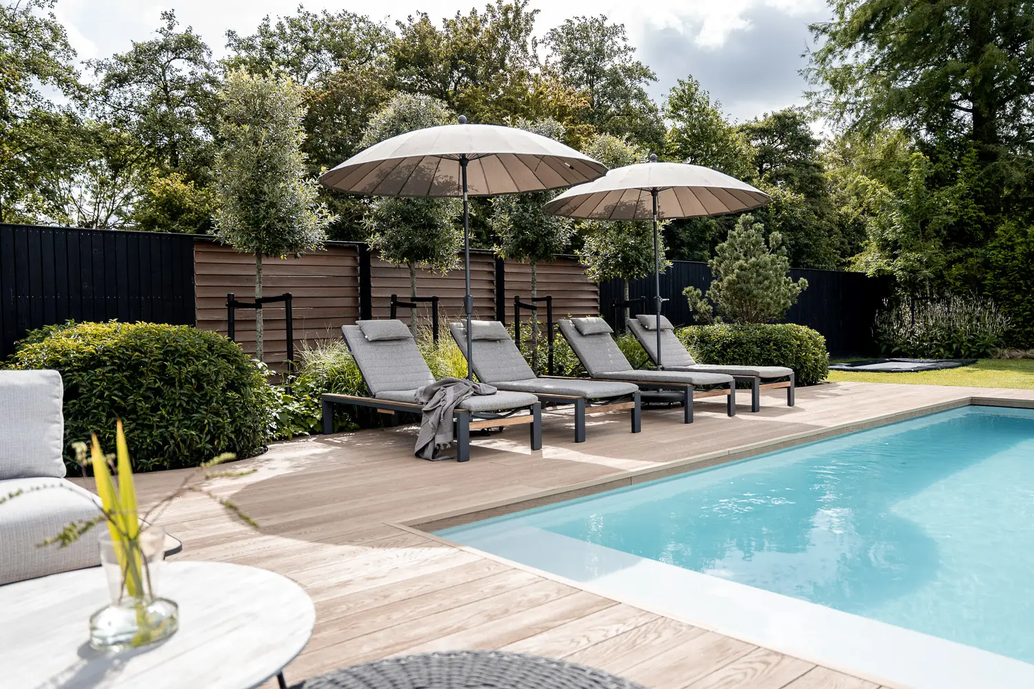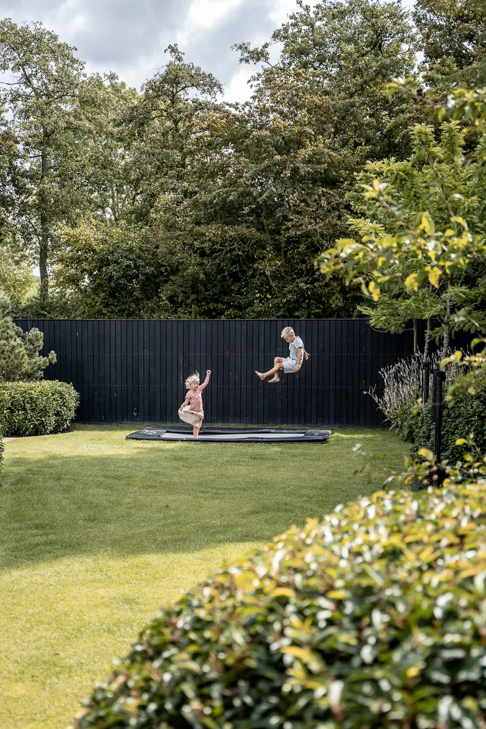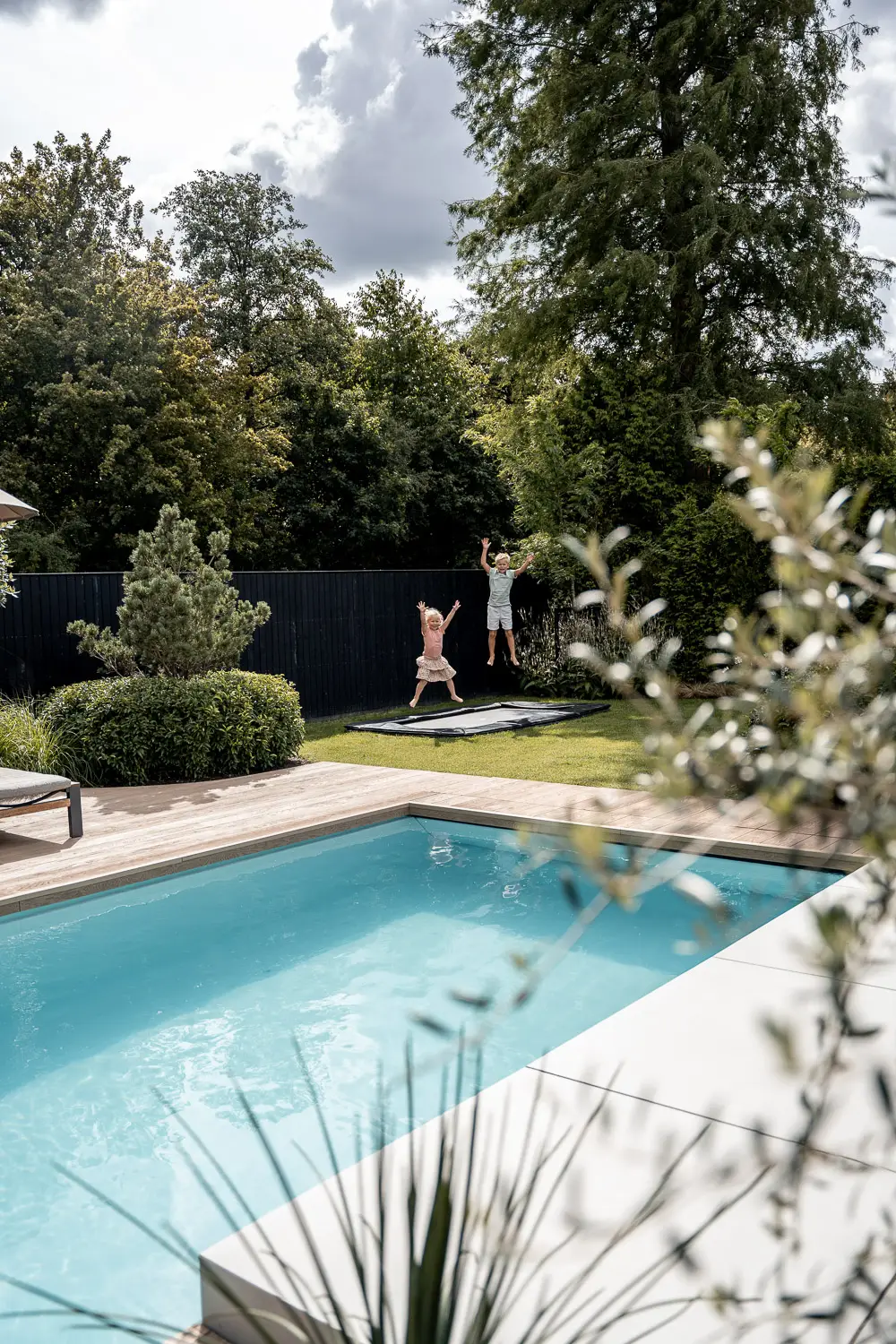 Blikvanger in de tuin is het zwembad, omringd door royale terrassen die volop ruimte bieden om te relaxen. De combinatie van een duurzame composiete vlonder en keramische maatwerk tegels zorgt voor een strakke en onderhoudsvriendelijke afwerking. Voor de kinderen is er een ingegraven trampoline, zodat zij veilig en onbezorgd kunnen spelen.
