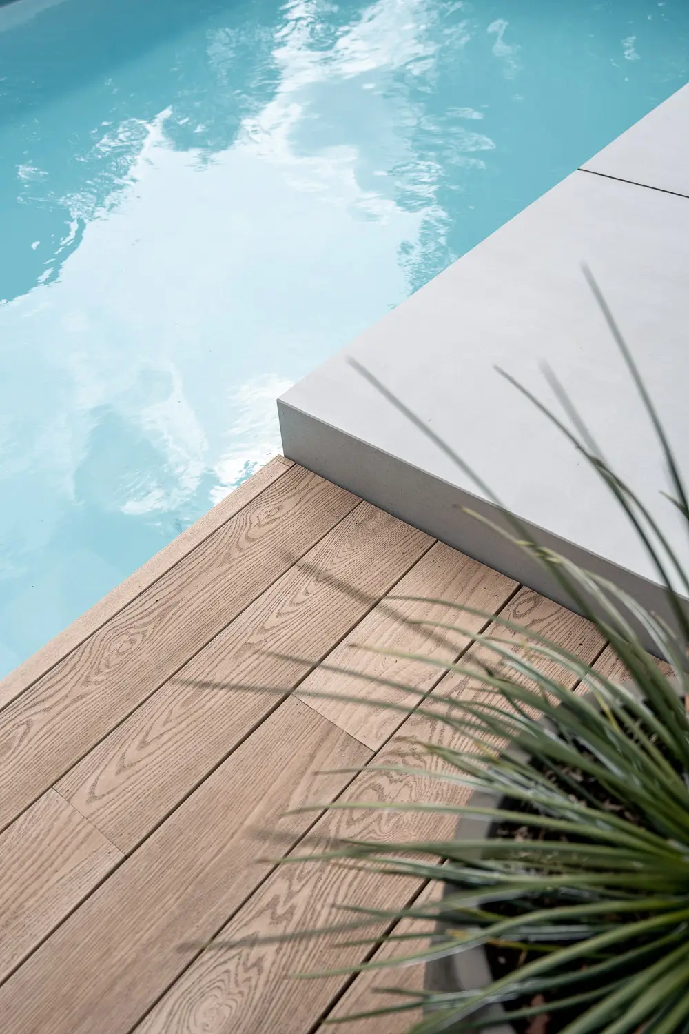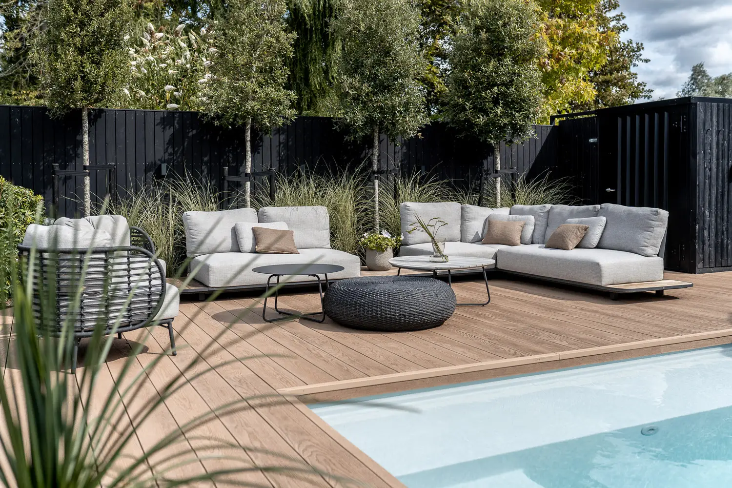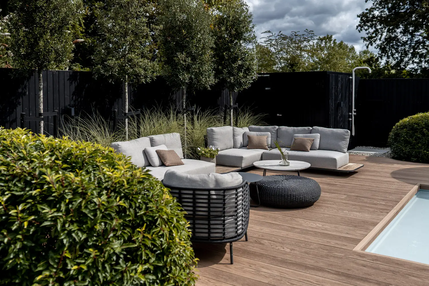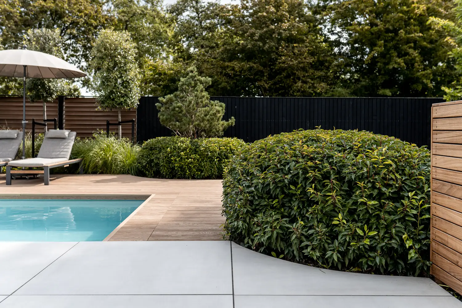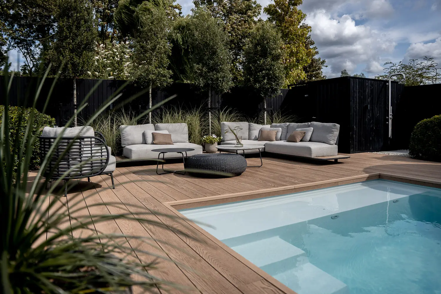 Blikvanger in de tuin is het zwembad, omringd door royale terrassen die volop ruimte bieden om te relaxen. De combinatie van een duurzame composiete vlonder en keramische maatwerk tegels zorgt voor een strakke en onderhoudsvriendelijke afwerking. Voor de kinderen is er een ingegraven trampoline, zodat zij veilig en onbezorgd kunnen spelen.