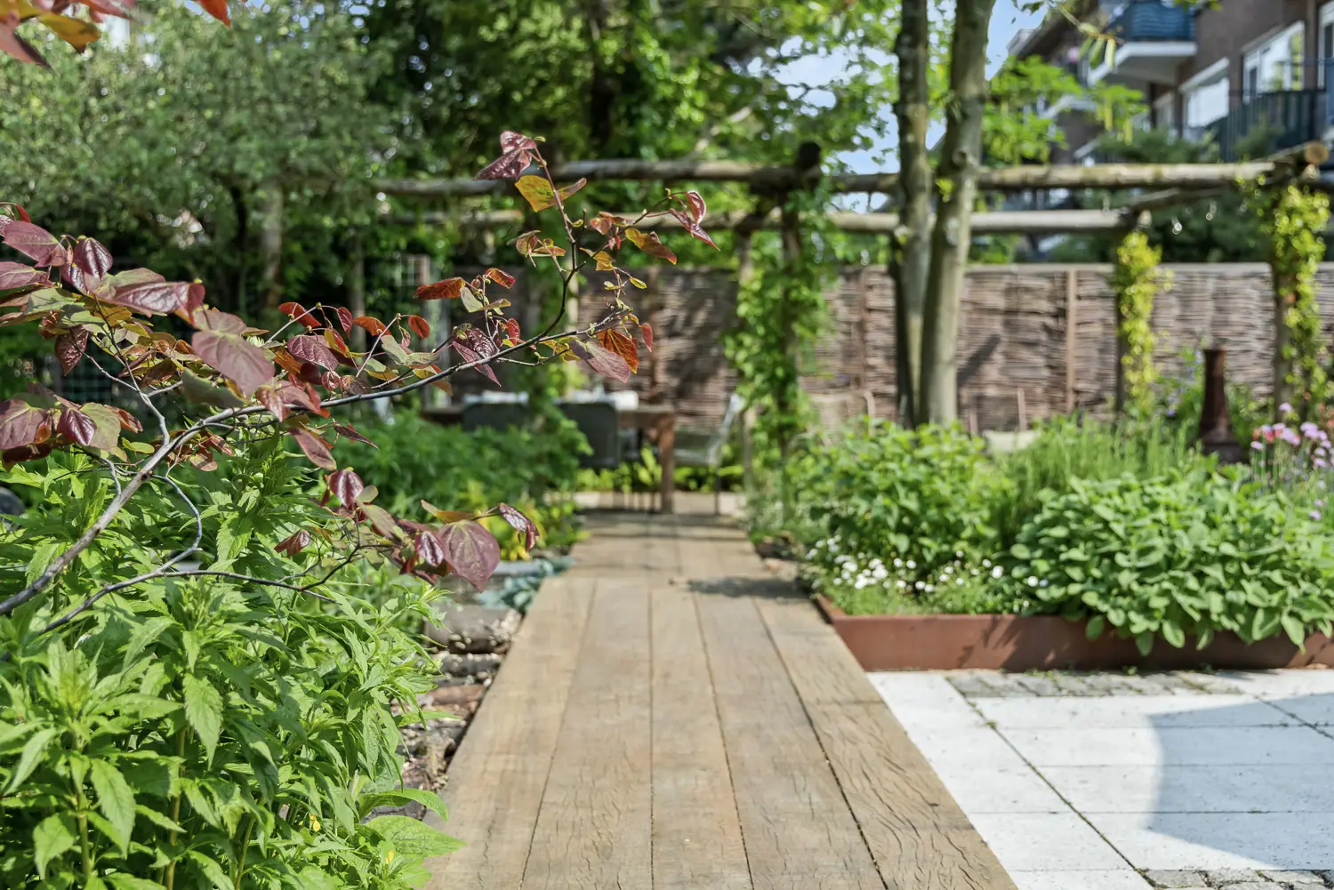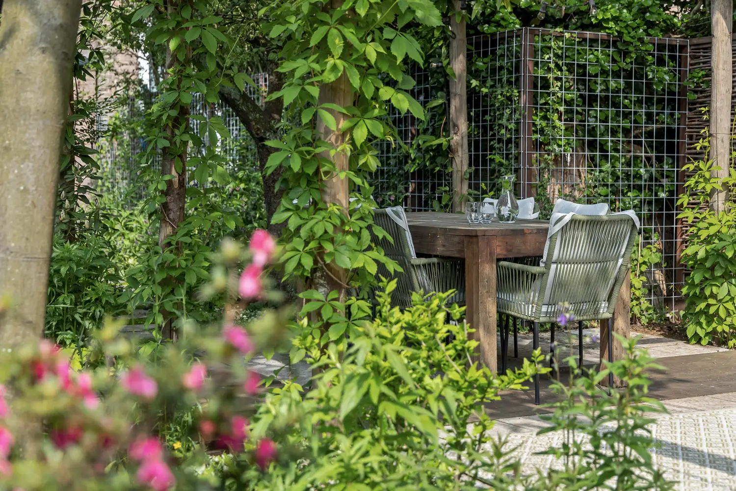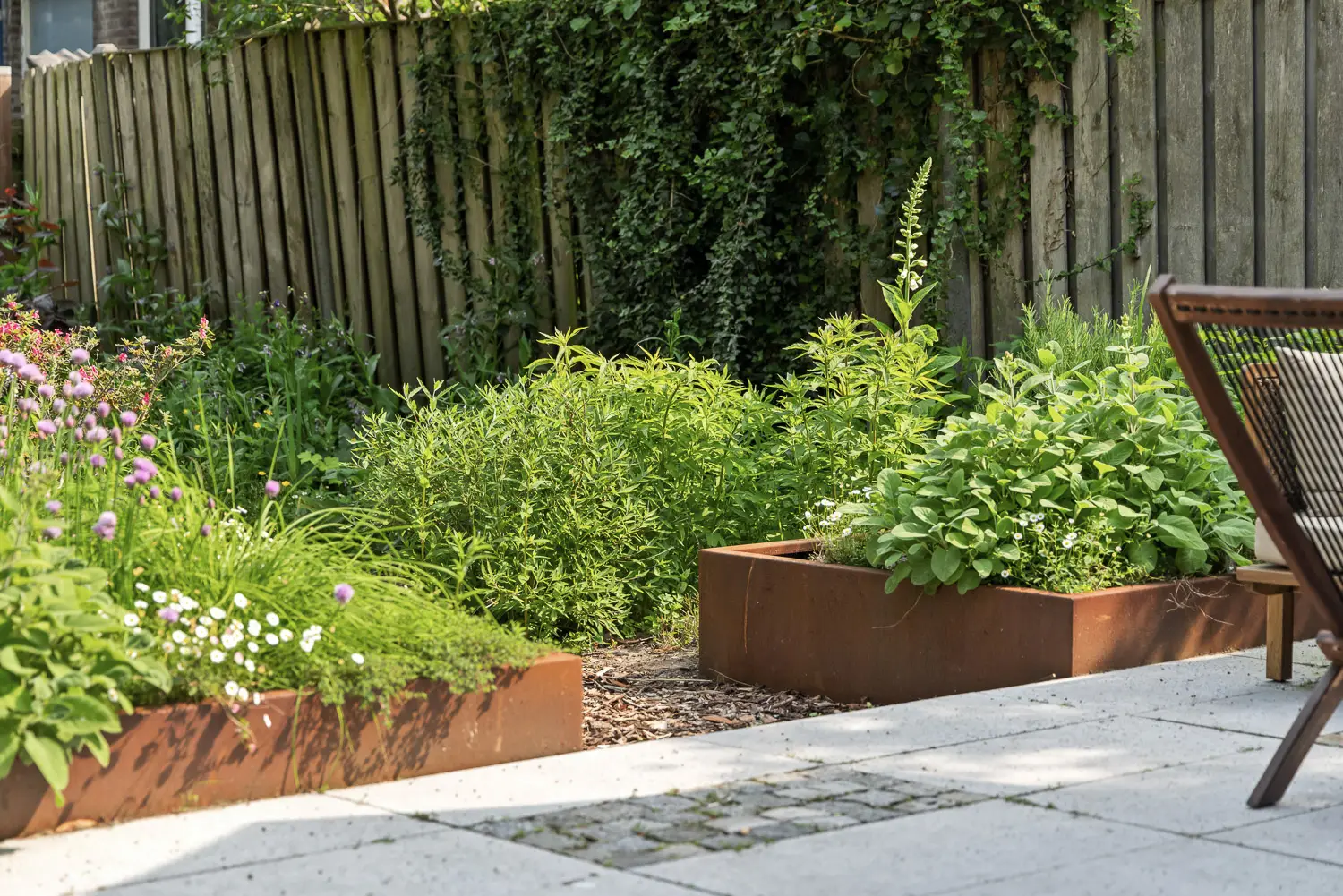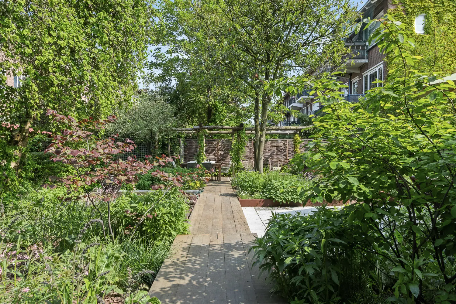Kortom: een tuin waar oude en ruwe elementen samenkomen met weelderig groen, zachte overgangen, natuurlijke materialen en rustgevende details. Een plek om adem te halen, te voelen en te genieten van het buiten zijn, midden in de stad.