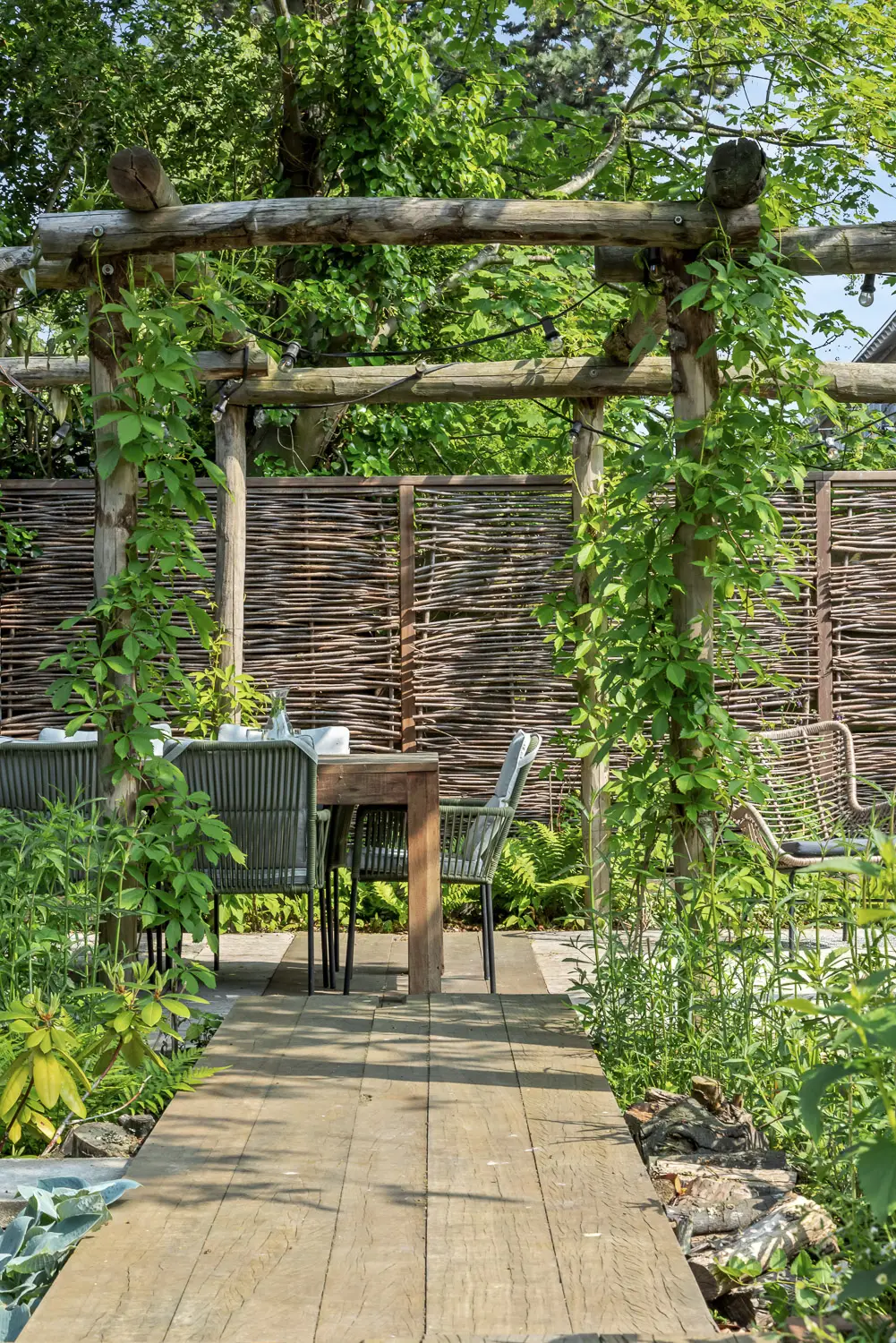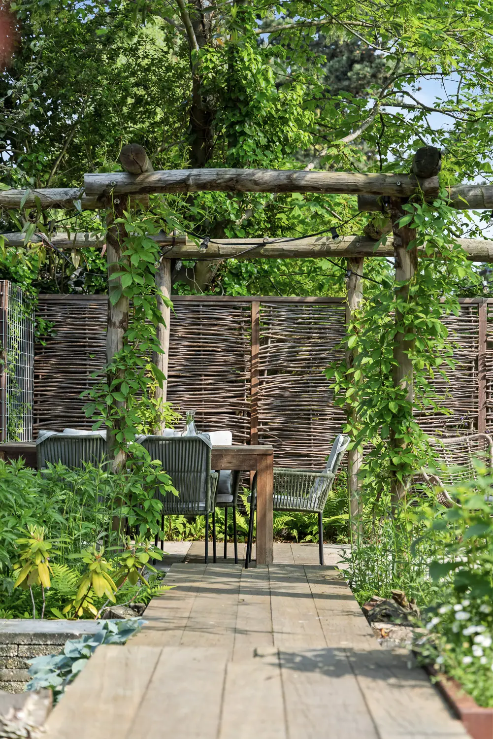 Daarnaast is er gekozen voor een subtiele pergola, uitgevoerd in geschilde kastanje palen, die het geheel niet domineert maar juist omarmt en omlijst. Deze pergola creëert beschutting, sfeer en daarnaast uitnodigende plekken om te zitten of te lezen.
