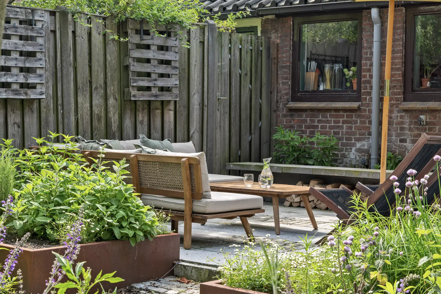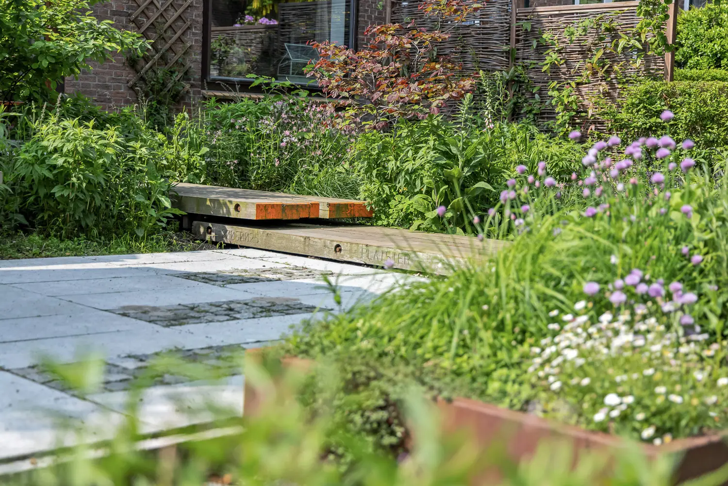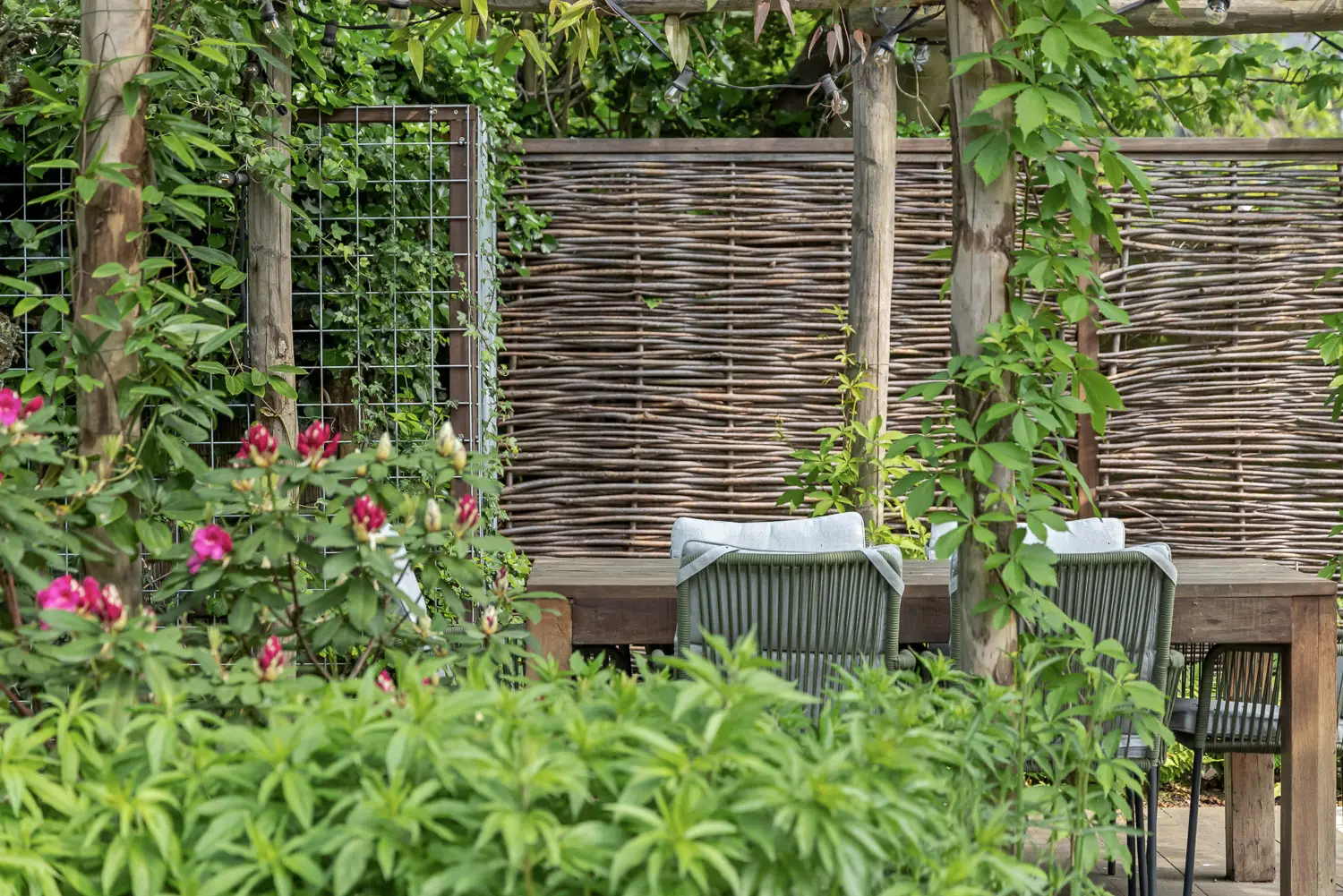De natuurlijke uitstraling krijgt extra kracht door de beplanting: een heerlijke mix van wilde, rijkbloeiende vaste planten zorgt voor kleur, geur en beweging, in contrast met de strakkere lijnen van hard materiaal. De erfafscheiding van wilgentenen versterkt het landelijke karakter — licht geschakeerd, ruim verzorgd — en voegt een bescheiden, ambachtelijke touch toe.