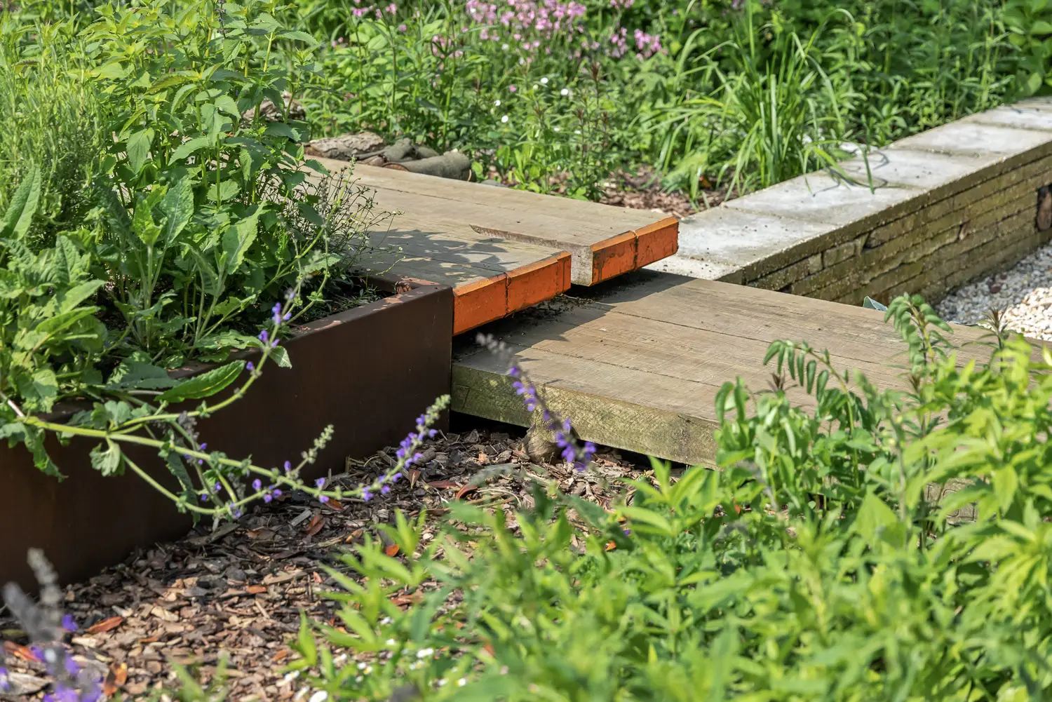 Wat meteen opvalt is het respect voor historie en gebruik van hergebruikte materialen: de stapelmuren zijn opgetrokken met 30×30 tegels, die vaak een tweede leven krijgen, en draglineschotten vormen verrassende, ruwe paden, loperend door de tuin. De combinatie van deze materialen met cortenstaal voegt sfeer en structuur toe, terwijl het geheel toch zacht en natuurlijk aanvoelt.