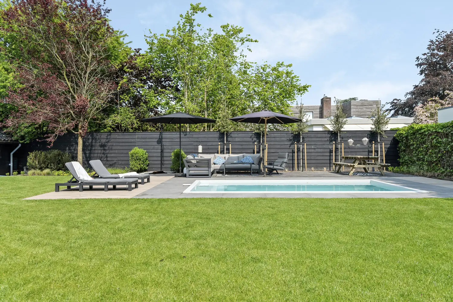 Het hart van de tuin is het zwembad, omgeven door royale vlakken met keramische tegels die zorgen voor een strakke, onderhoudsvriendelijke uitstraling. Naast het zwembad vinden we een elegante buitendouche — ideaal om af te koelen na een duik, zonder dat dit afbreuk doet aan de serene sfeer.