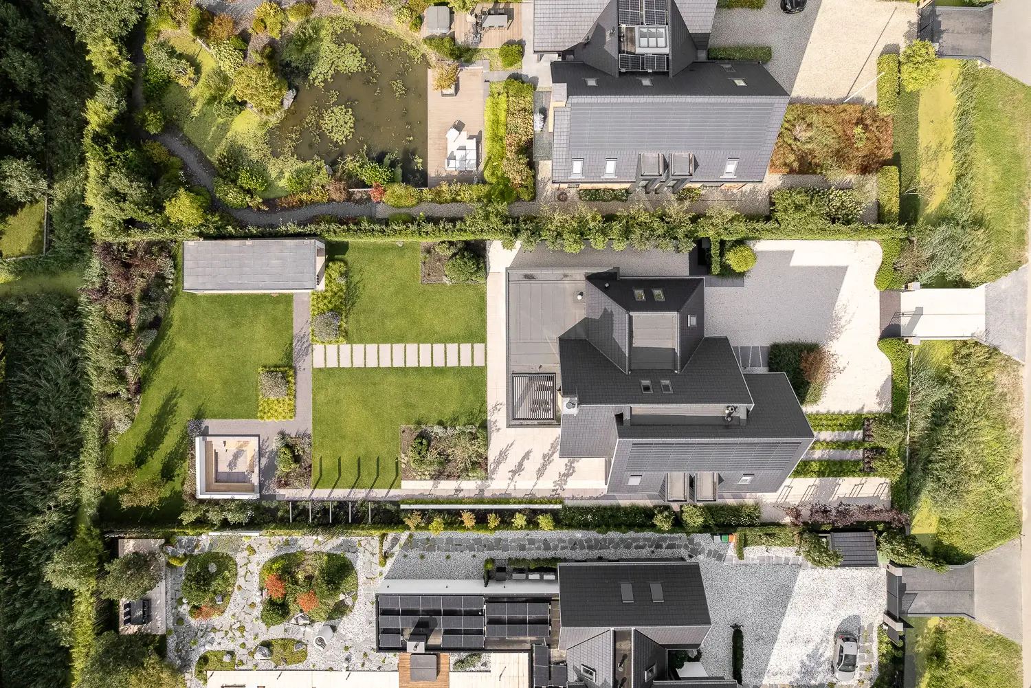 Praktisch gemak mocht natuurlijk niet ontbreken. Dankzij een geïntegreerde maairobot blijft het gazon altijd strak, terwijl mollengaas onder het gras voor een duurzaam en probleemloos resultaat zorgt. Ondertussen is de woning door een bestaande klant van ons gekocht en mogen wij ook het tuinonderhoud weer met zorg verzorgen: een mooi compliment voor ons team.