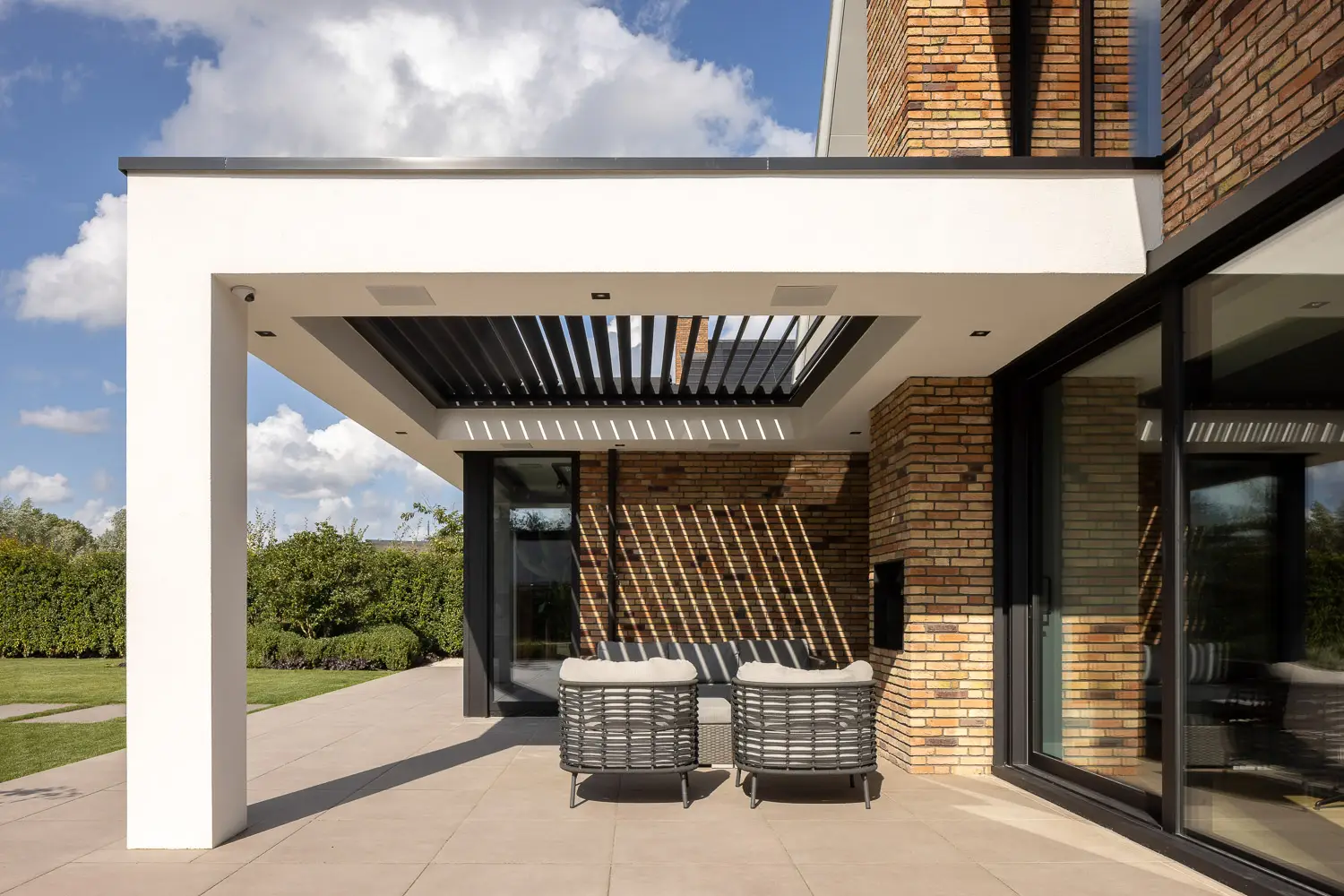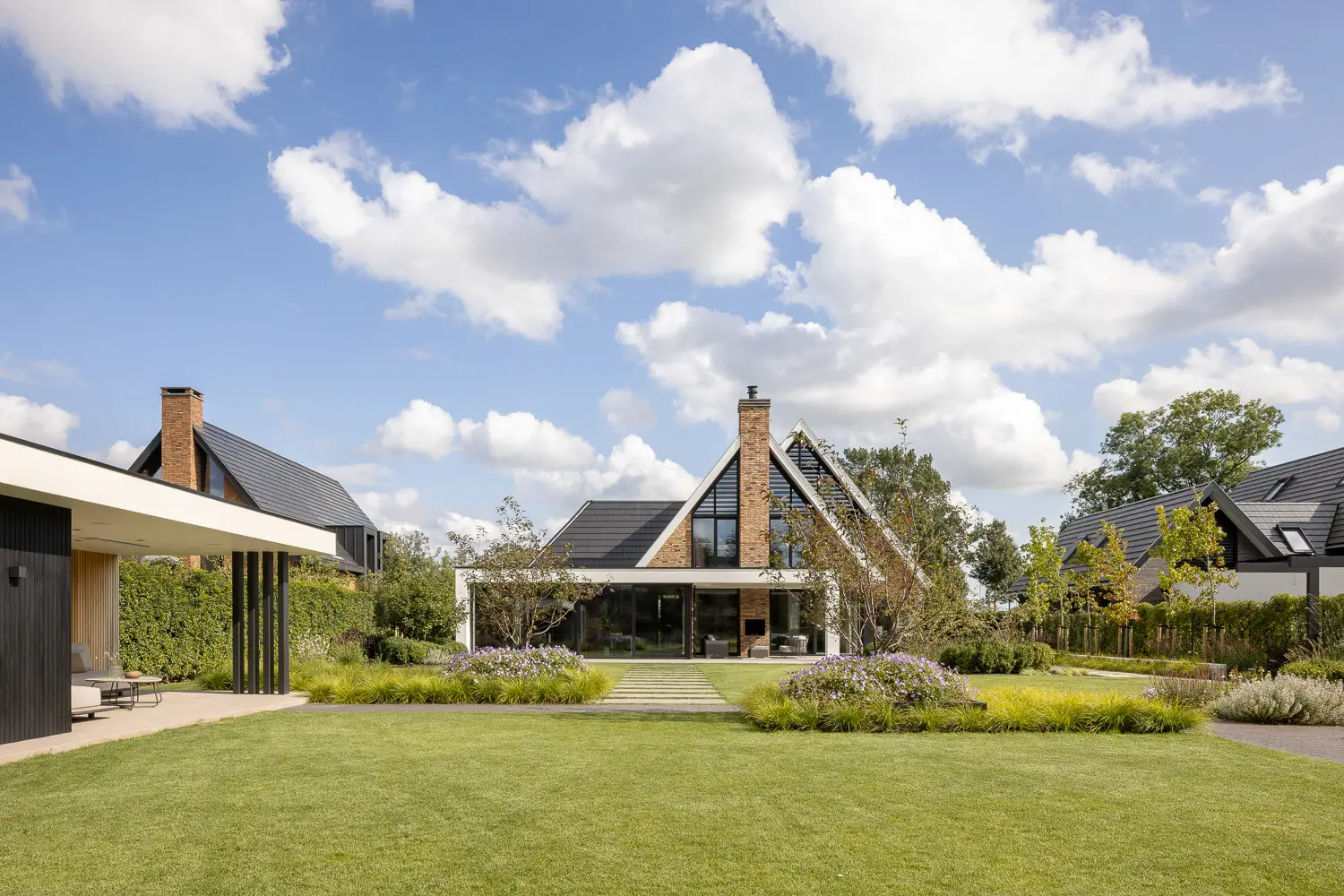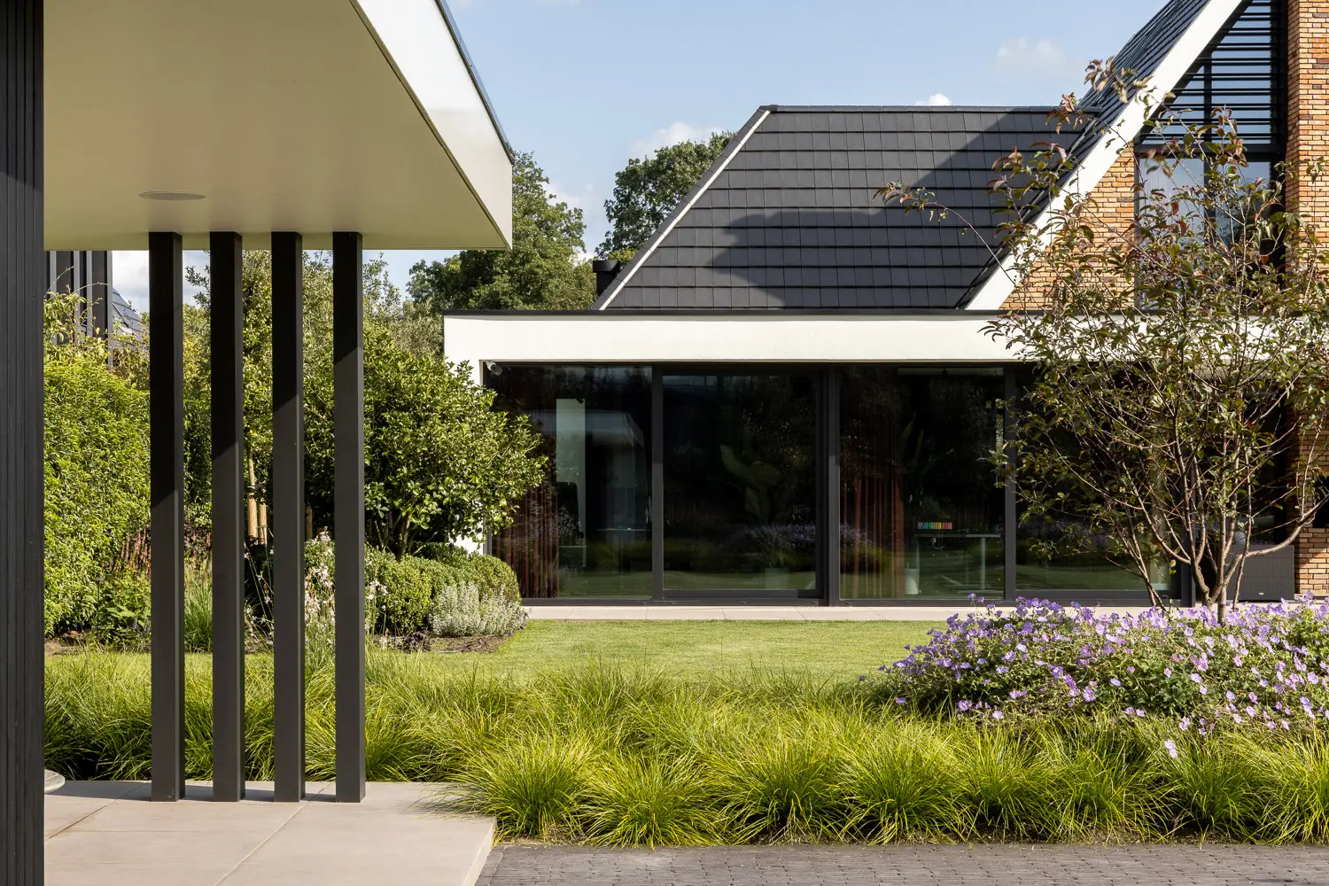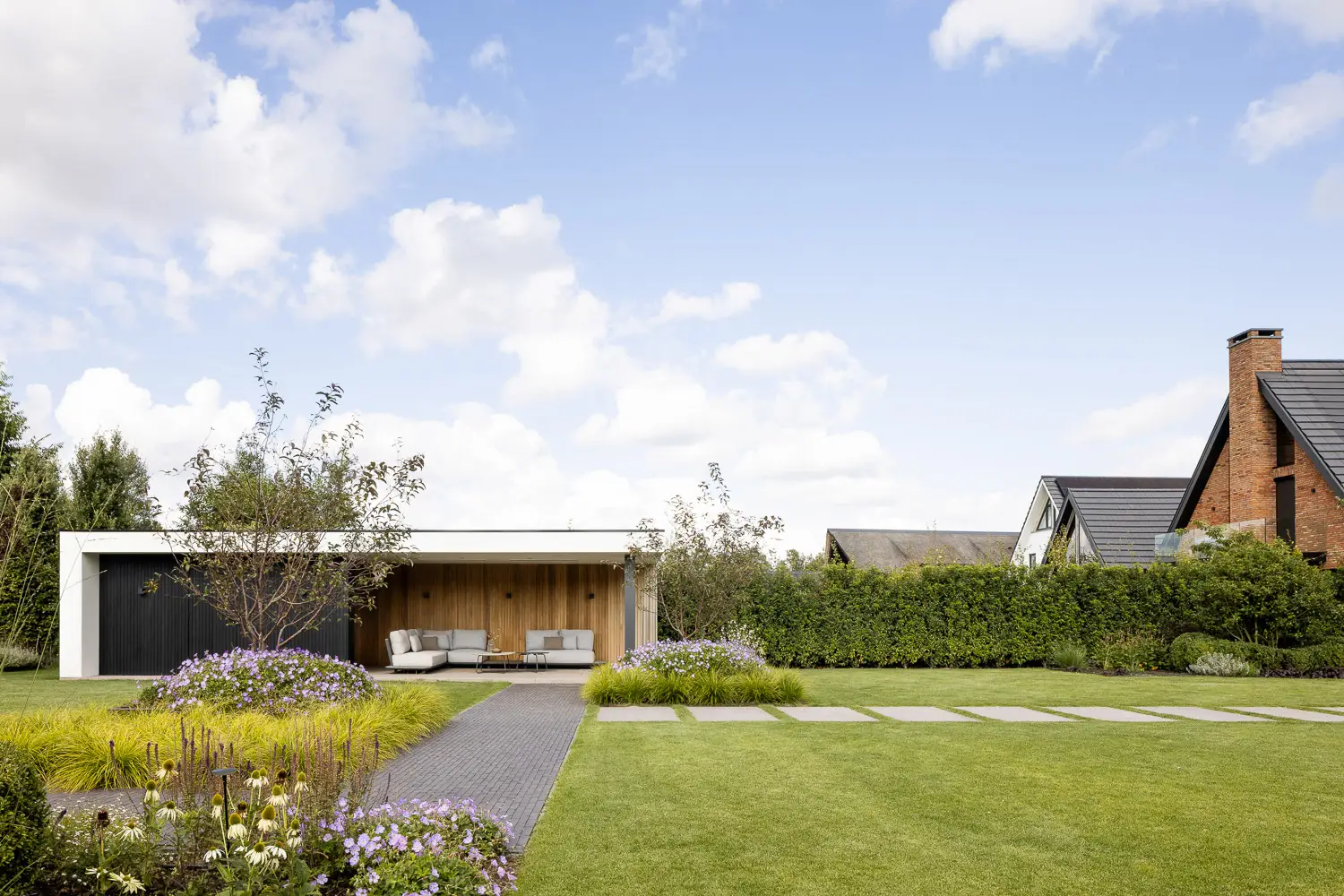 De tuin sluit naadloos aan op de strakke lijnen van de woning en biedt tegelijkertijd volop ruimte voor spelen, ontspannen en genieten.