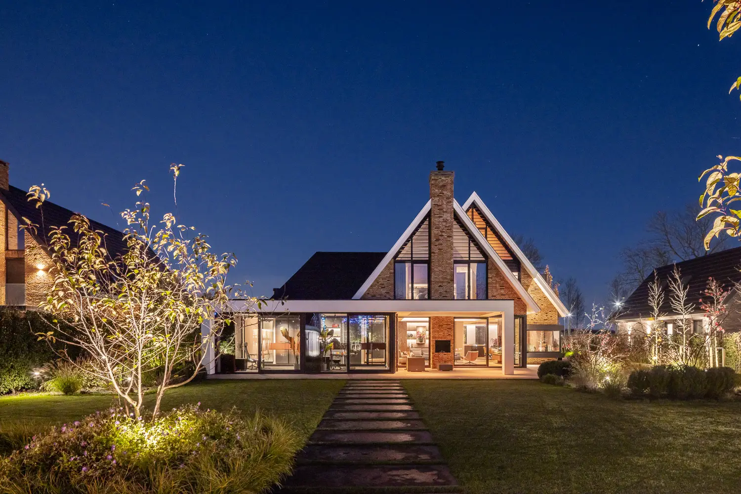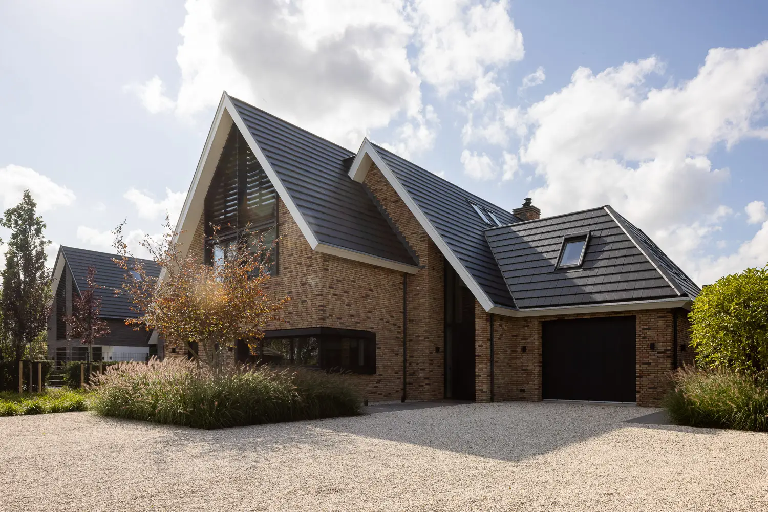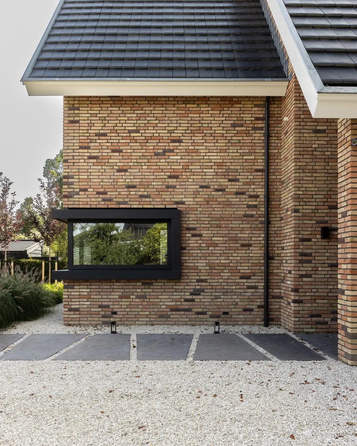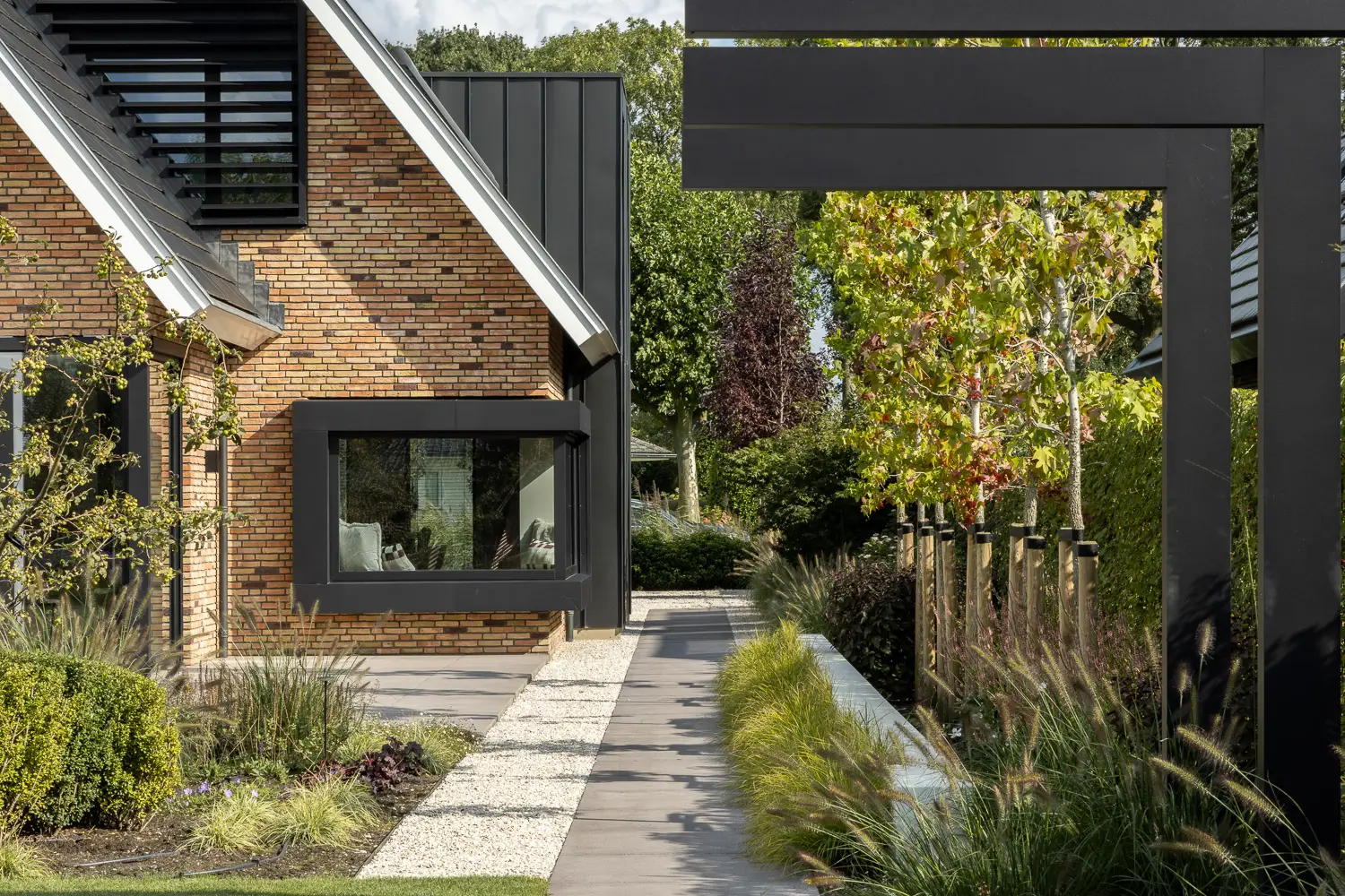 De tuin sluit naadloos aan op de strakke lijnen van de woning en biedt tegelijkertijd volop ruimte voor spelen, ontspannen en genieten.