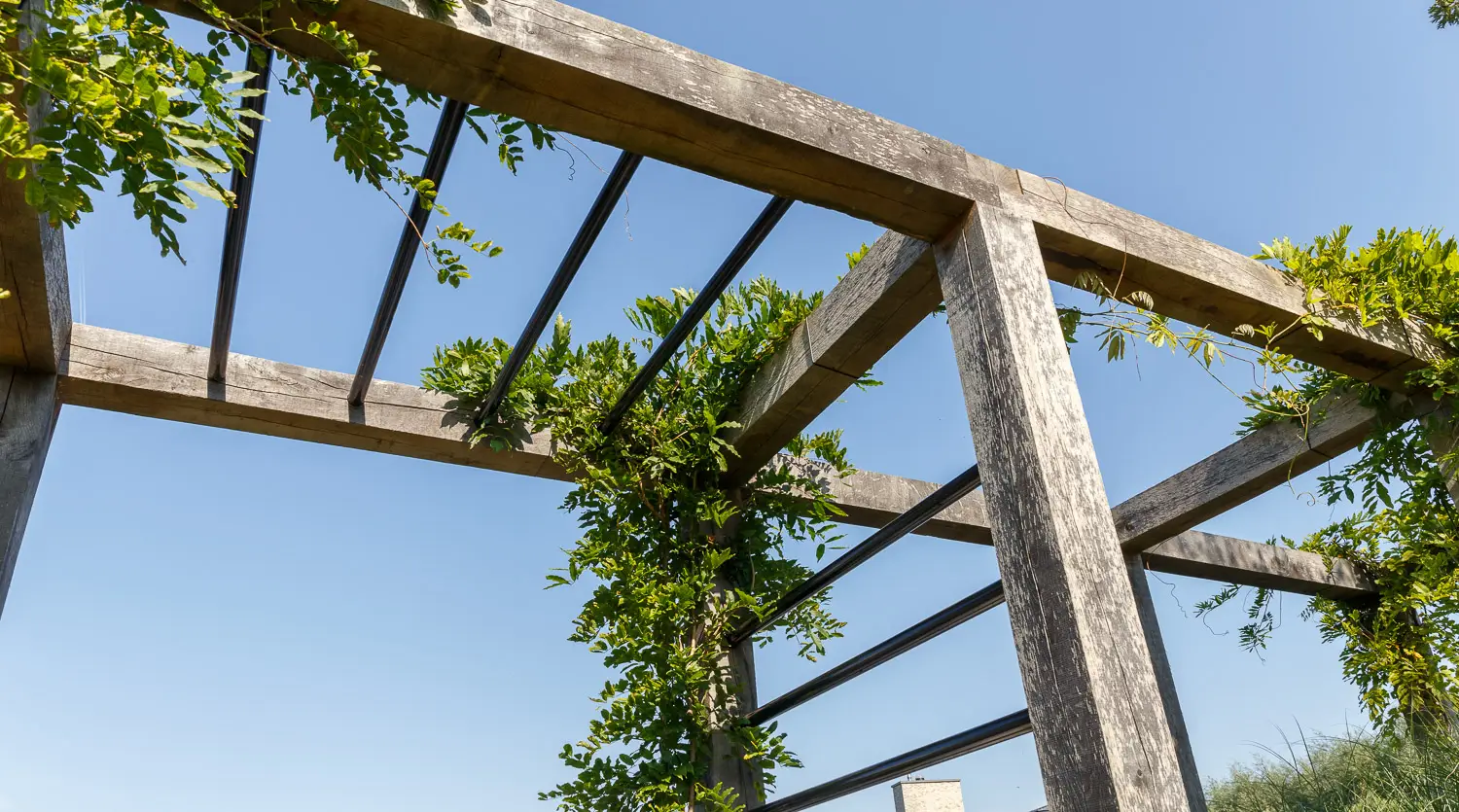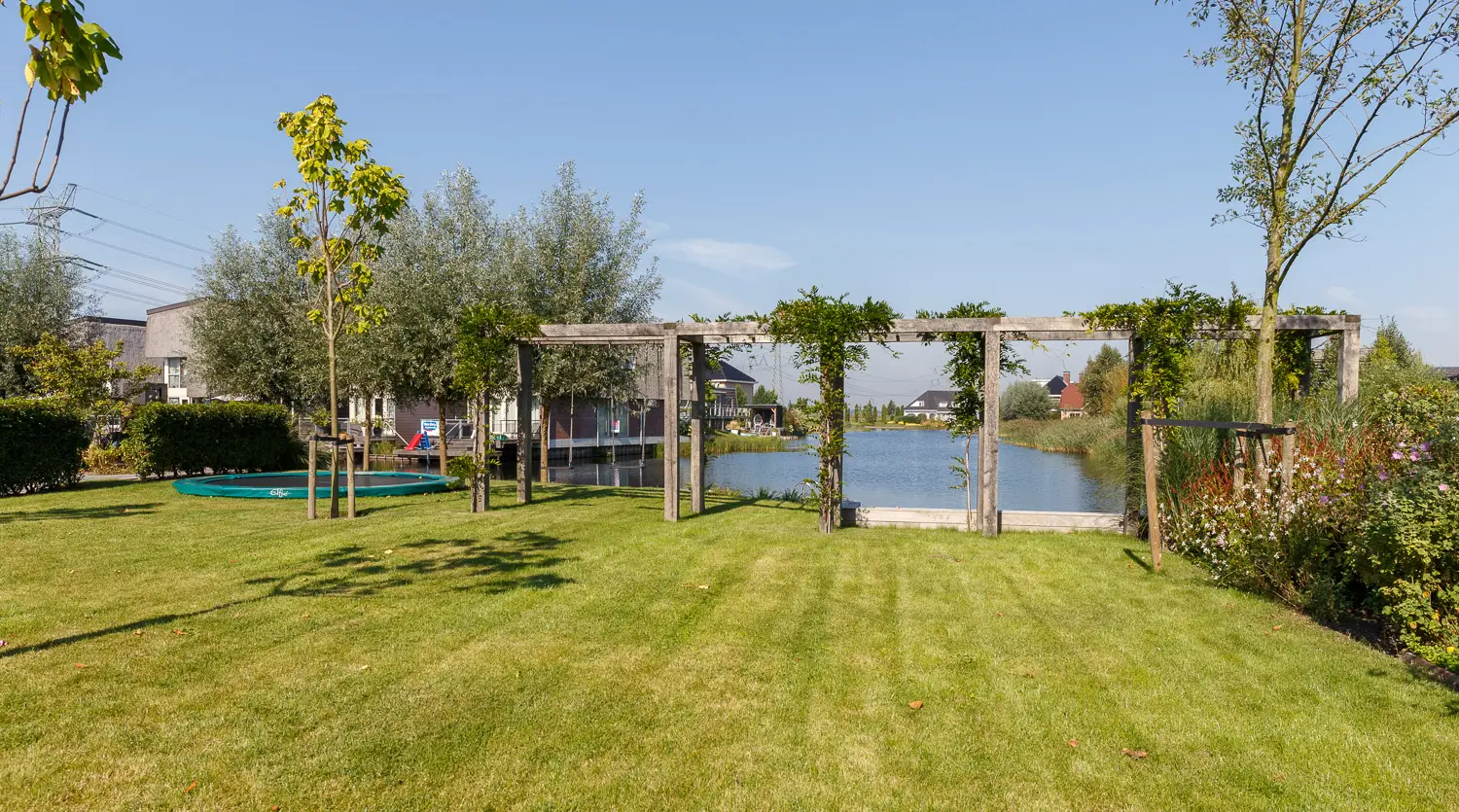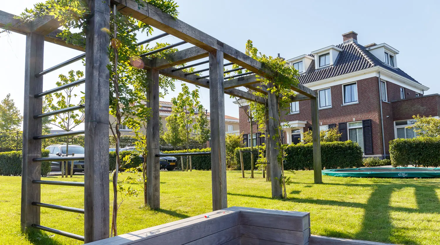 Rondom het huis is gekozen voor siergrassen die elegant meebewegen met de wind, waardoor een zachte overgang ontstaat tussen tuin en omgeving. Een robuuste eikenhouten pergola dient niet alleen als stijlvolle overkapping, maar ook als klimtoestel voor kinderen: een vorm die uitnodigt tot spelen en ontdekken. Verder is een trampoline geïntegreerd in het terras, zodat de jongsten volop ruimte hebben om te springen en plezier te maken.