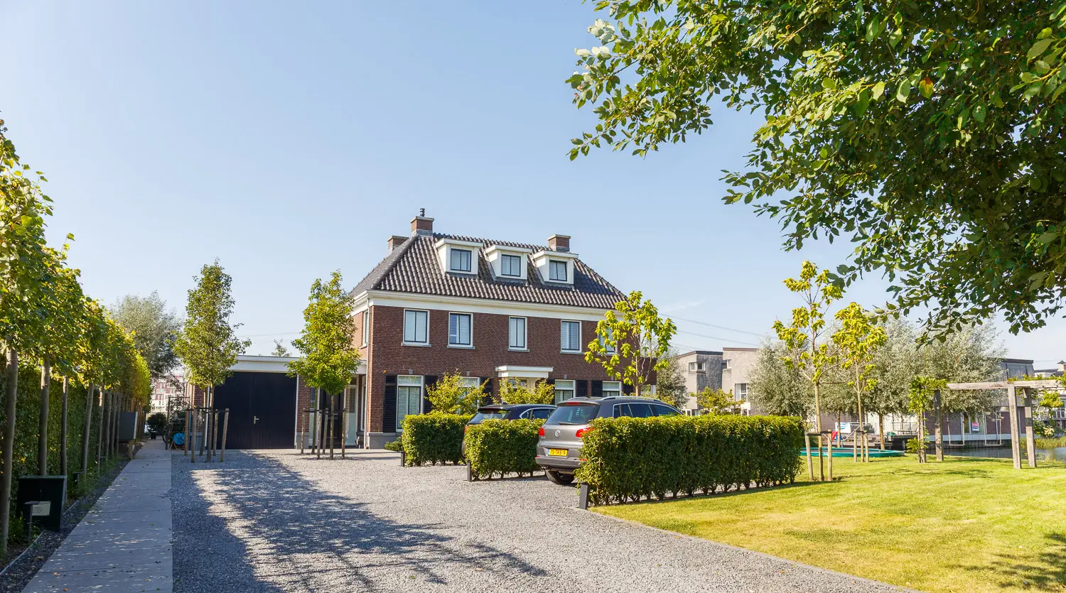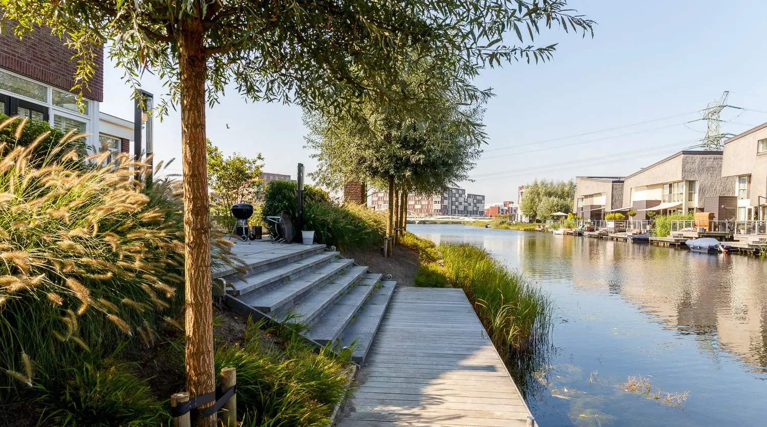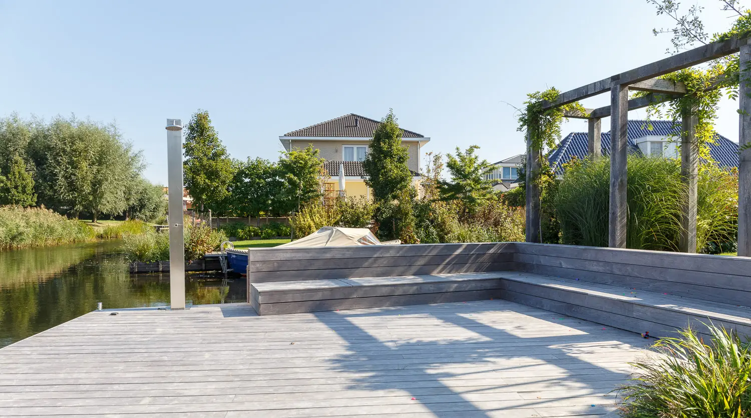 De terrassen zijn gelegd met Schellevis tegels, die met hun oud-Hollandse structuur en hoogwaardige afwerking zorgen voor uitstraling en duurzaamheid. De vlonderdelen zijn van Ipe hardhout, blint gemonteerd voor een naadloze uitstraling en subtiele maar luxe accenten langs het water en rondom de pergola.