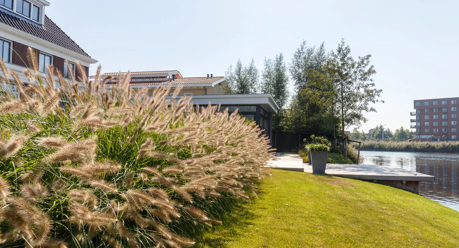 Deze villatuin aan het water in Nesselande is een buitengewoon samenspel van rust, spel en natuur. Het ontwerp van Mirella van De Tuinfabriek speelt met zichtlijnen naar het water, speelse elementen voor het gezin én stijlvolle materialen die de luxe uitstraling versterken.
