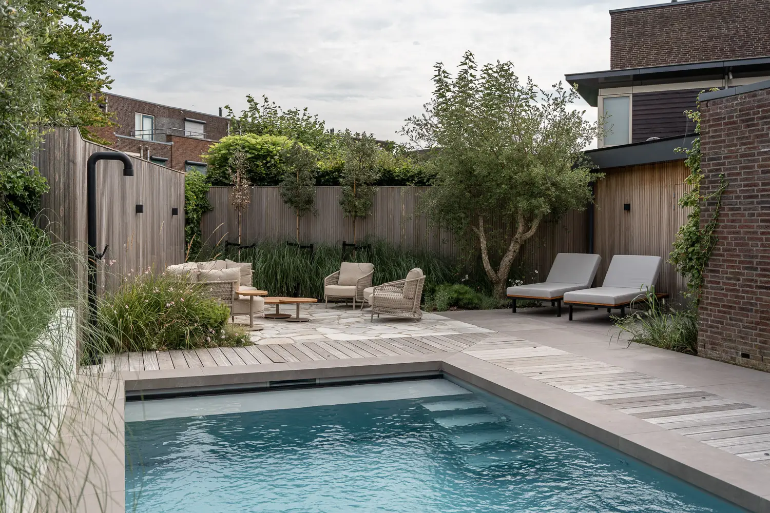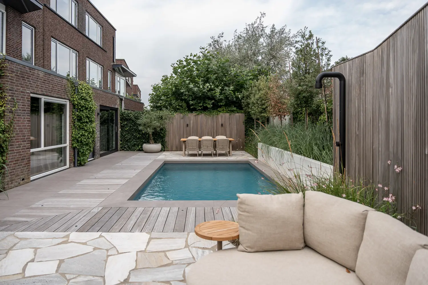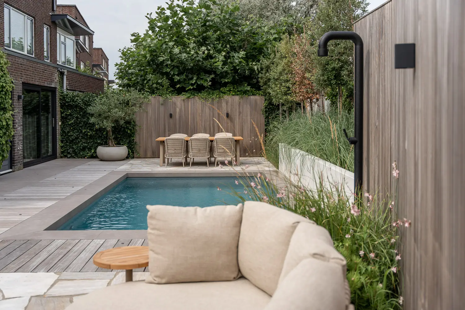 Naast het zwembad is een stijlvolle buitendouche geplaatst – perfect voor een frisse start van de dag of om na een duik in het water af te koelen. Samen vormen zwembad en douche hét wellness-element dat deze tuin uniek en compleet maakt.