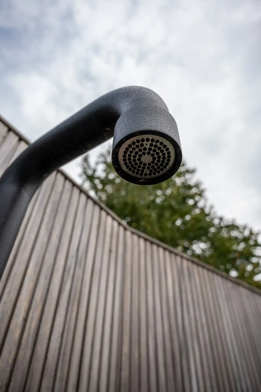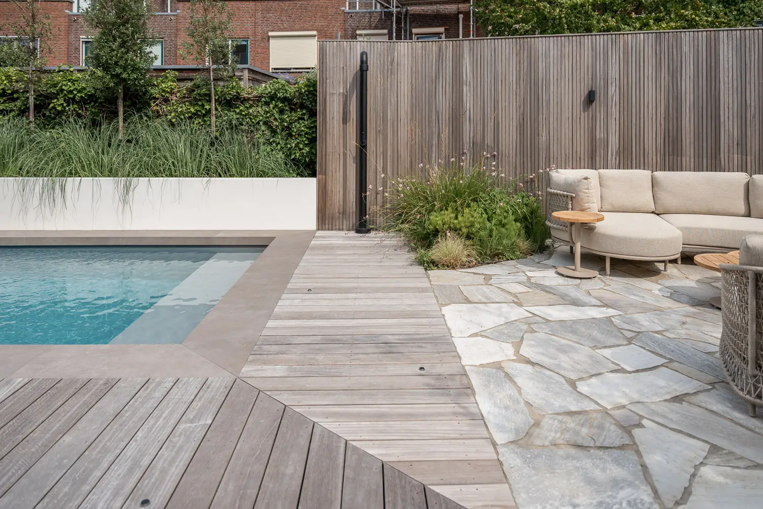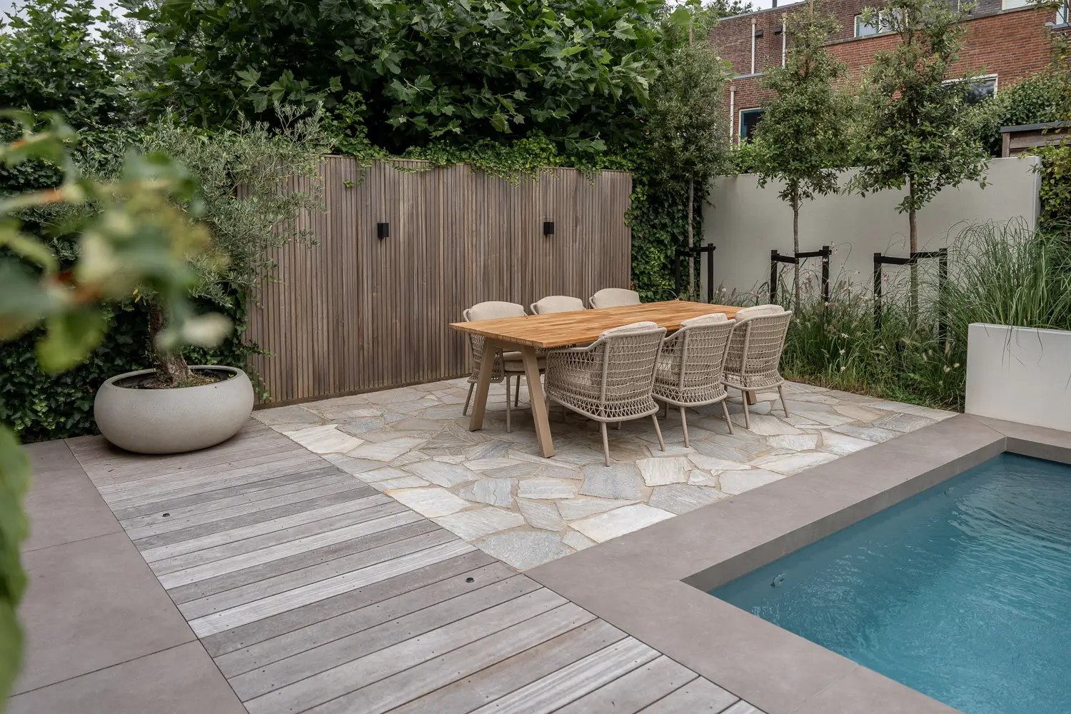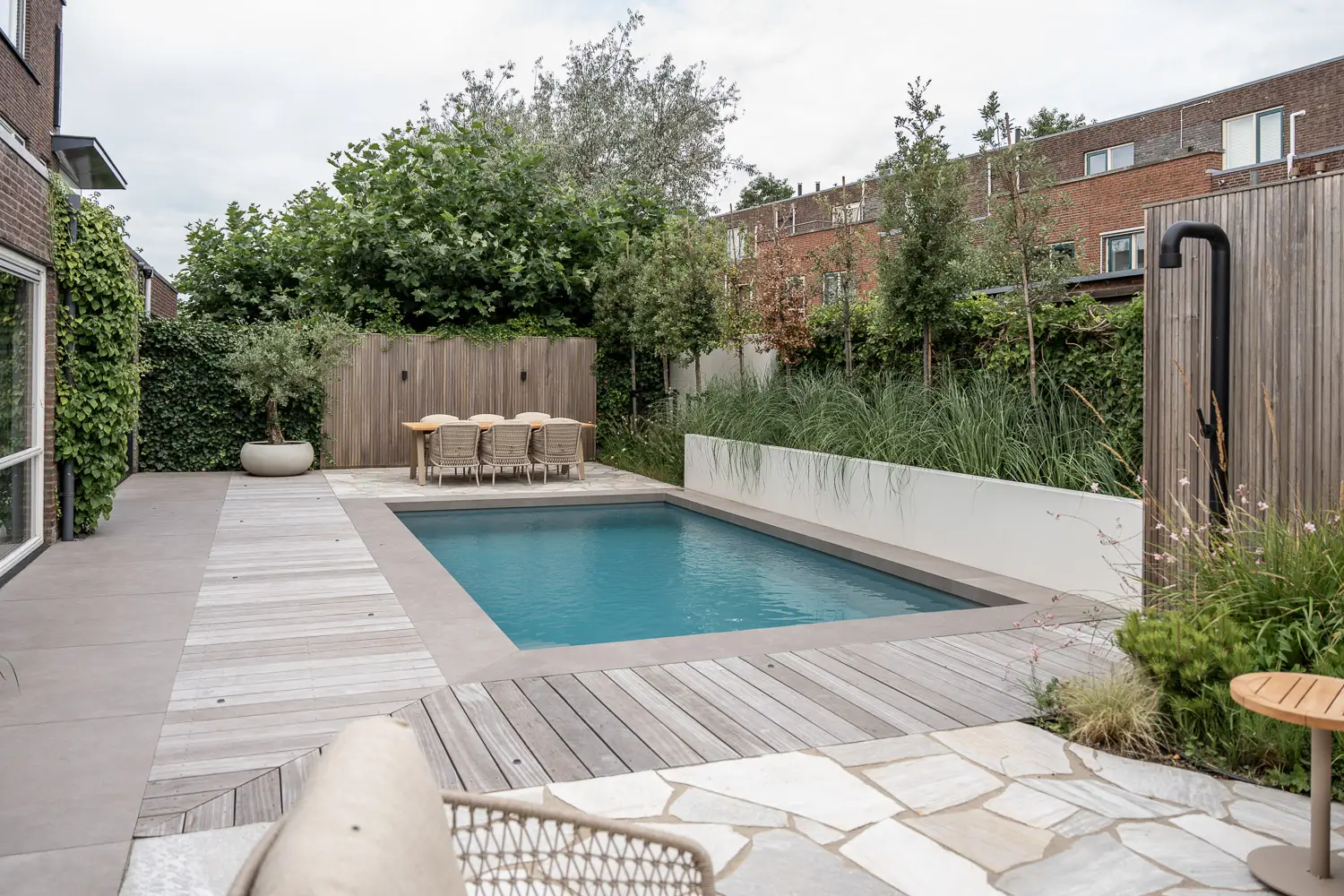 Naast het zwembad is een stijlvolle buitendouche geplaatst – perfect voor een frisse start van de dag of om na een duik in het water af te koelen. Samen vormen zwembad en douche hét wellness-element dat deze tuin uniek en compleet maakt.