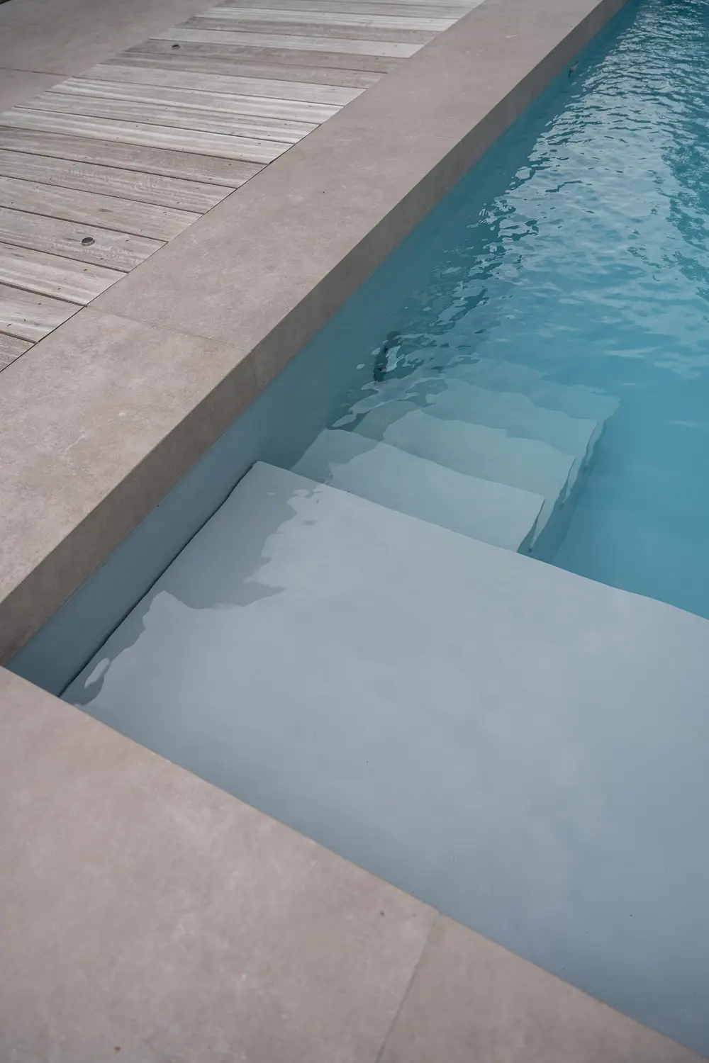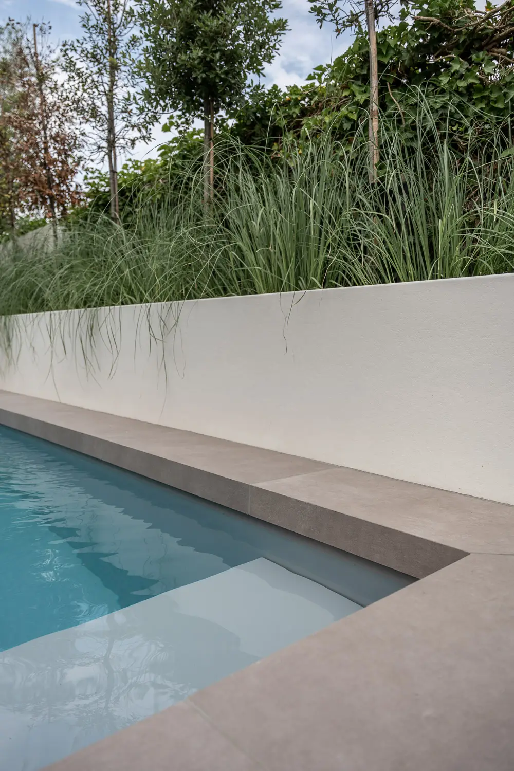 De beplanting met meerstammige kurkeiken geeft de tuin een groene en mediterrane uitstraling, terwijl de bestrating met flagstones en keramiek in Romfix drainage mortel zorgt voor een stabiele en duurzame ondergrond. ’s Avonds benadrukt Inlite verlichting de lijnen en sfeer van de tuin, waardoor de beleving nog intenser wordt.