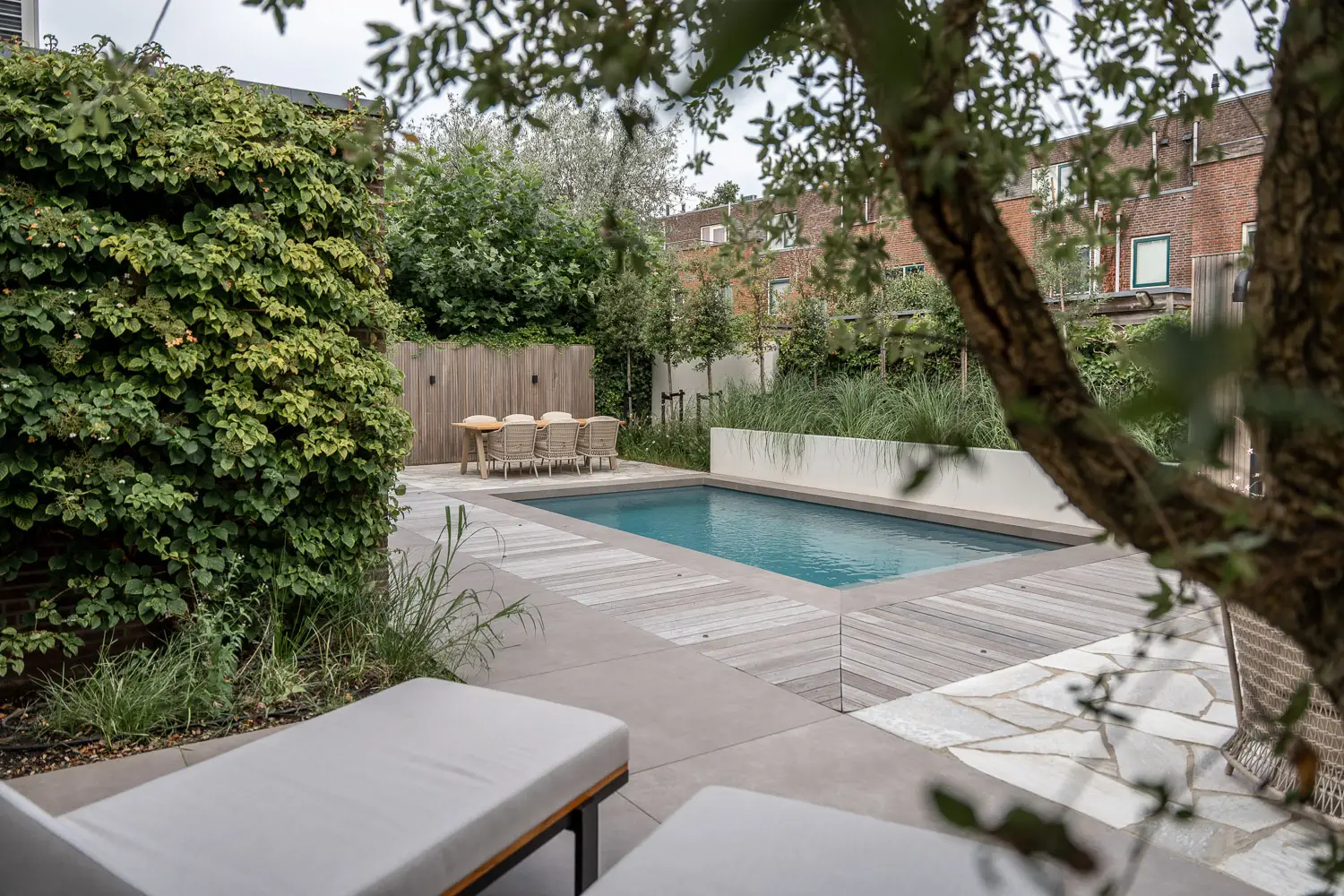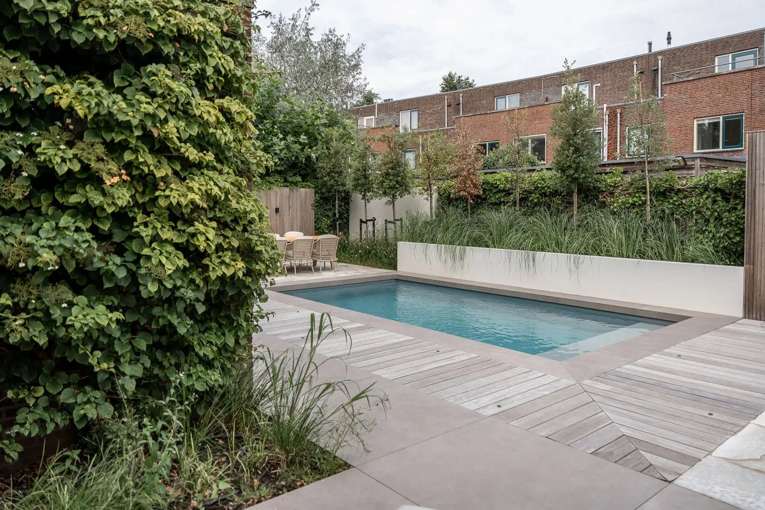 In deze heerlijke wellness tuin staat ontspannen centraal. Het hart van de tuin wordt gevormd door een royaal zwembad, omringd door een warme hardhouten vlonder en veel ruimte om te genieten.