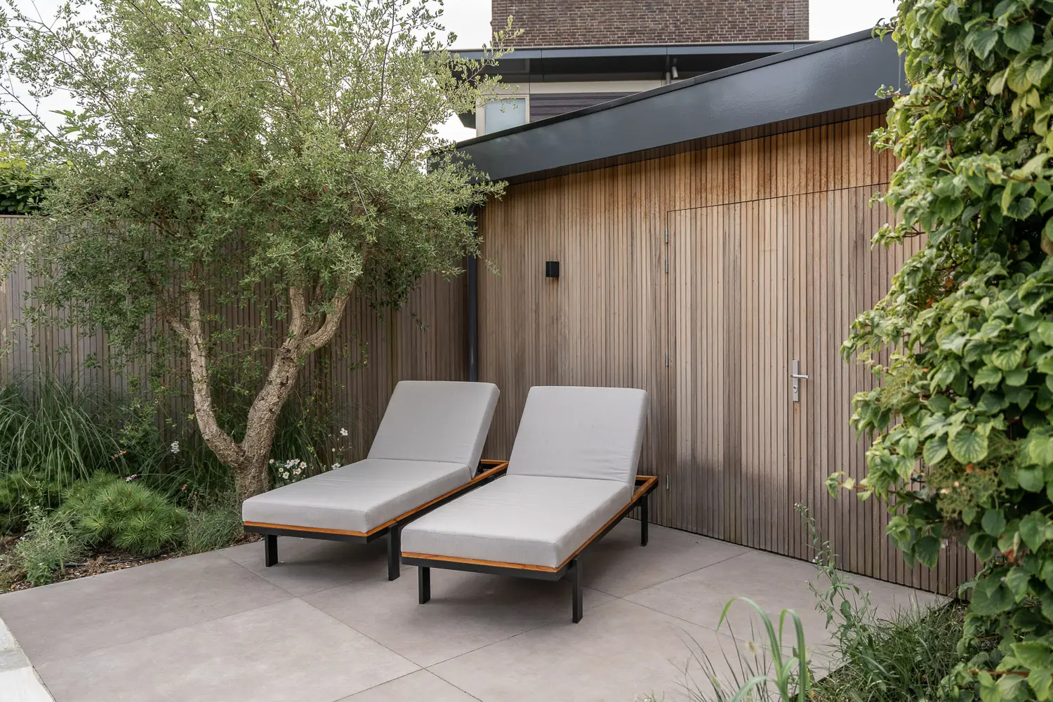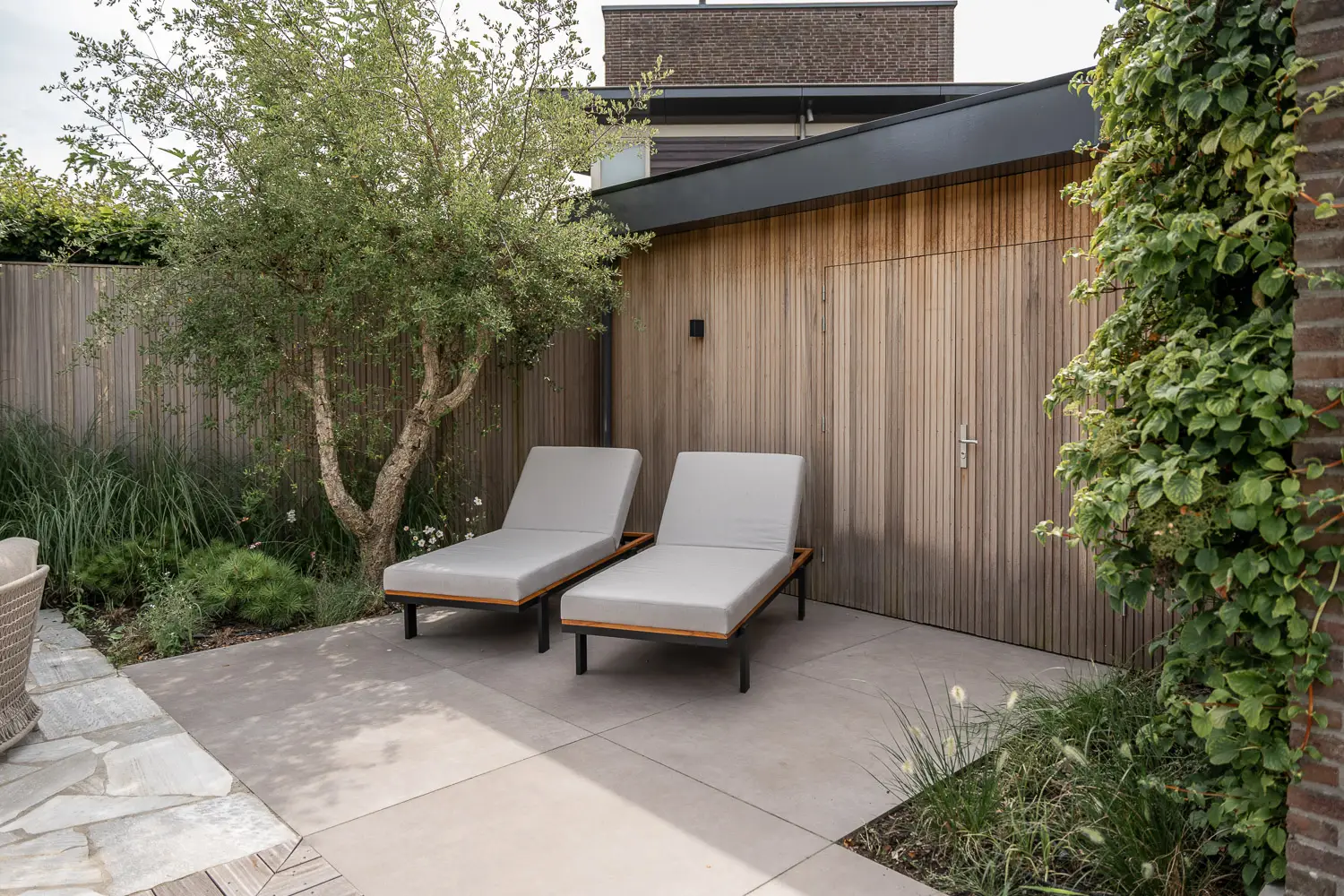 De luxe sfeer wordt versterkt door een op maat ontworpen schuur en strakke plantenbakken en muren van Adezz.