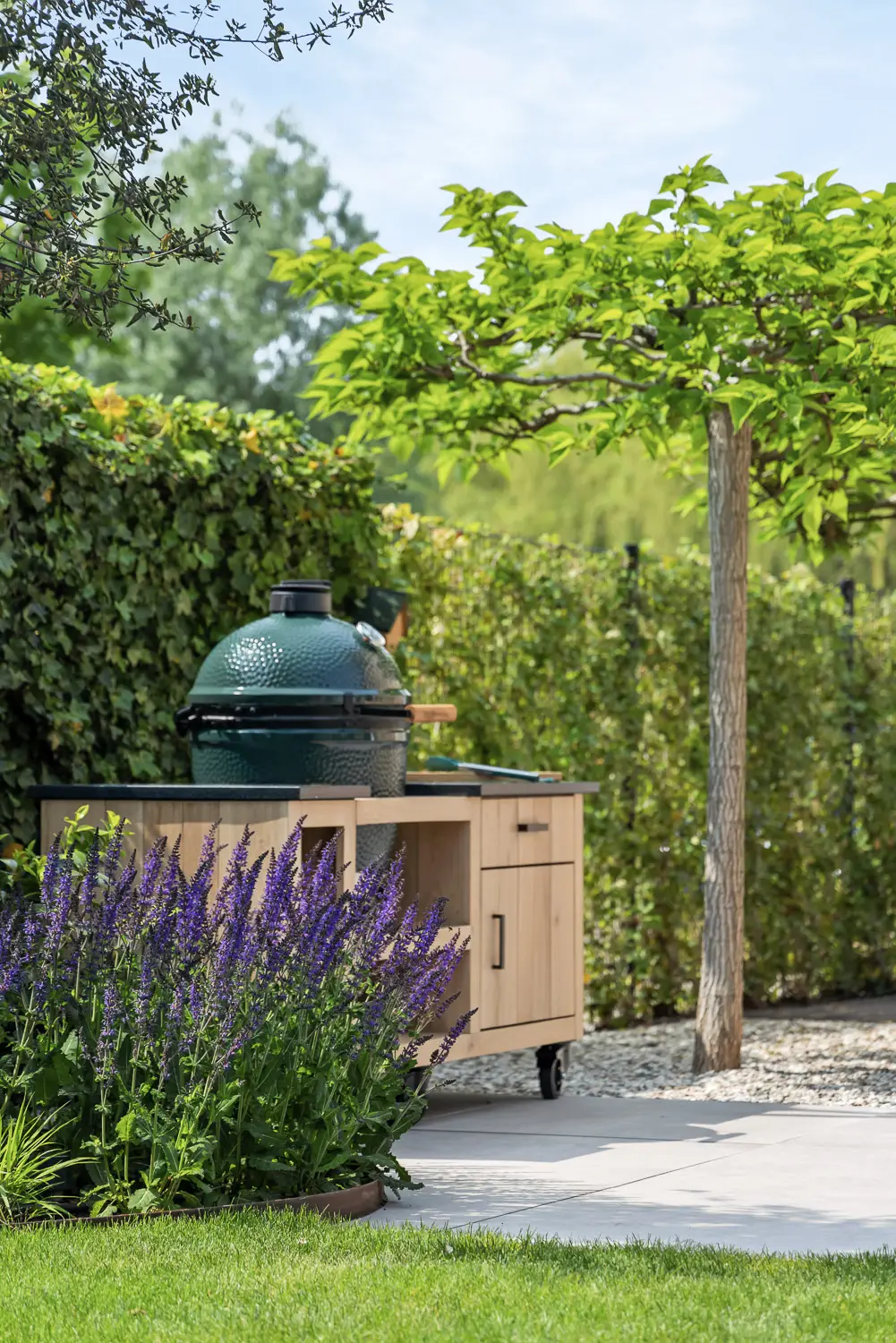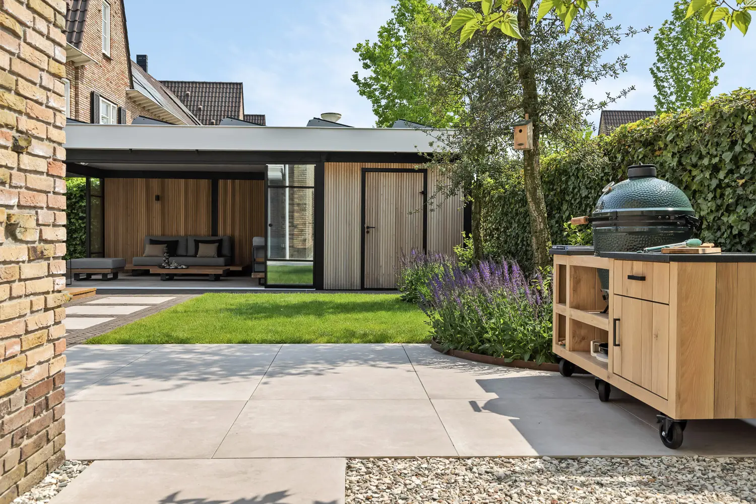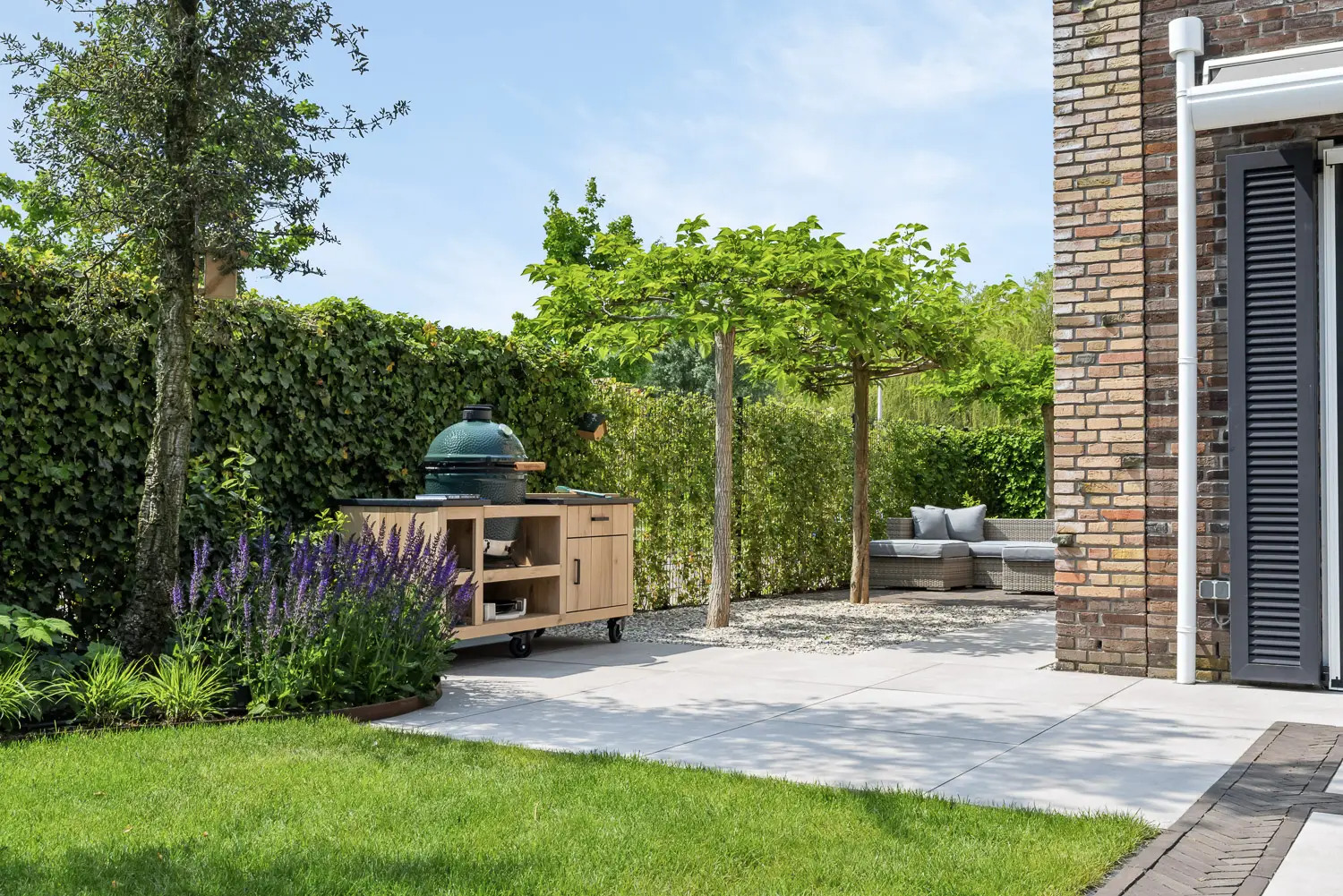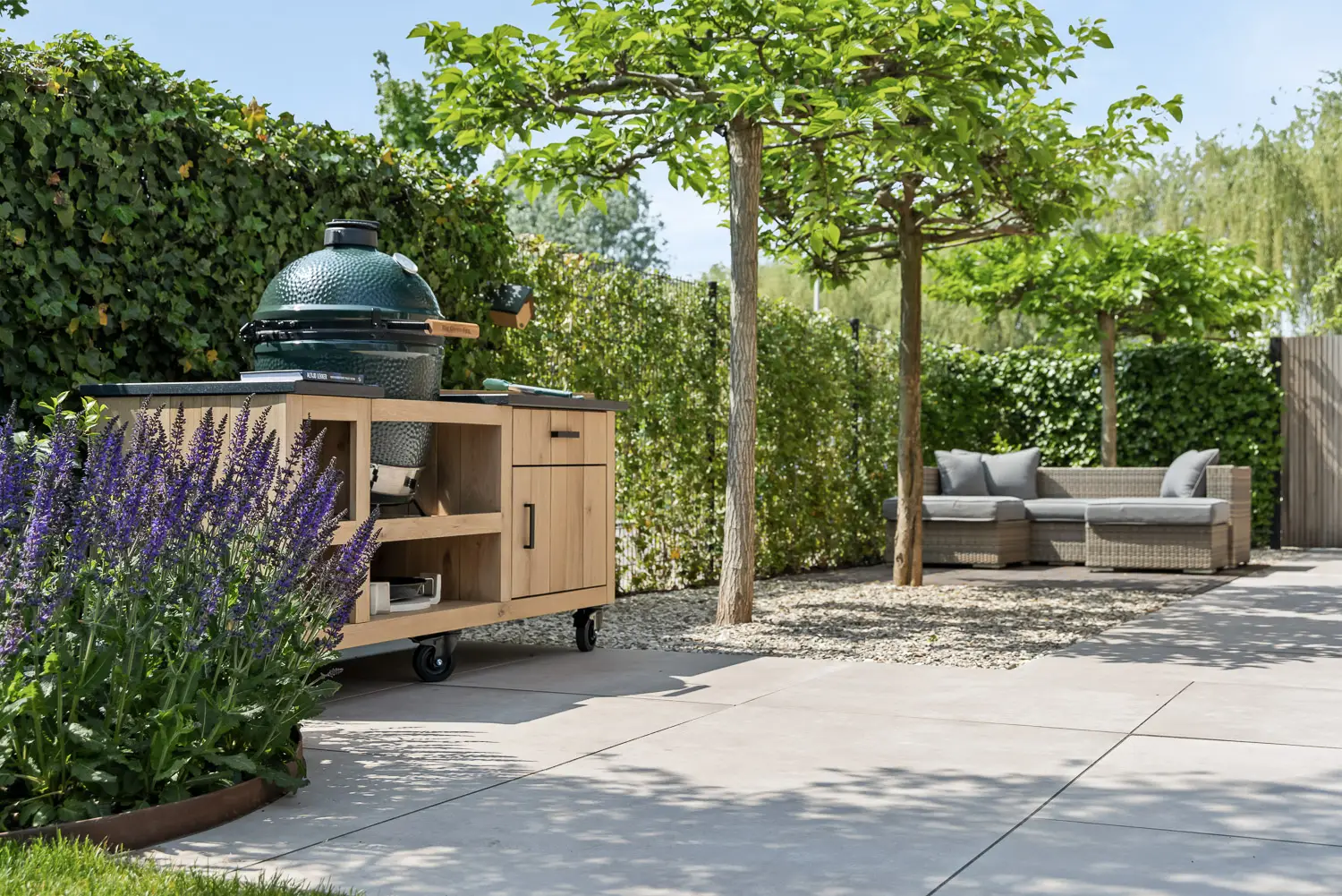 Voor de culinaire liefhebber is een ruime buitenkeuken gerealiseerd, compleet met een Green Egg: perfect voor grillen, roken en slow cooking als onderdeel van outdoor living. De keuken krijgt extra allure door de combinatie van hoogwaardige materialen: een Millboard vlonder (composiet) vormt de verbinding tussen binnen- en buitenruimte; daarnaast zijn er gebakken klinkers in visgraat én keramische tegels 120×120 gebruikt voor vloeren en terrassen, gelegd op een degelijke ondergrond in Romfix.