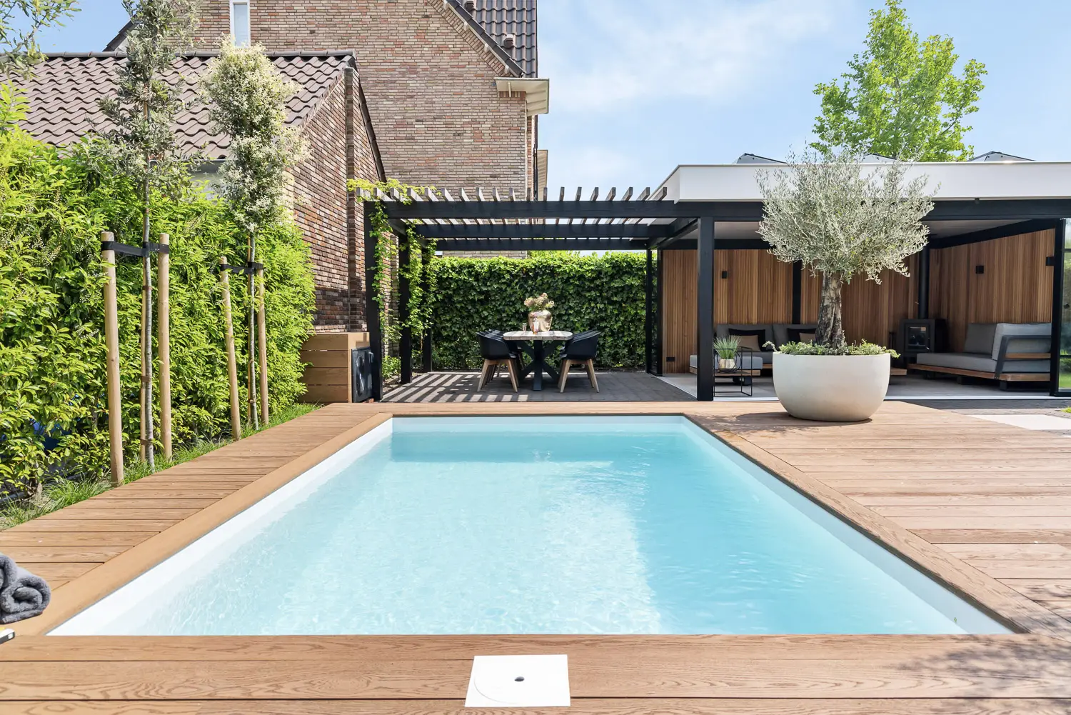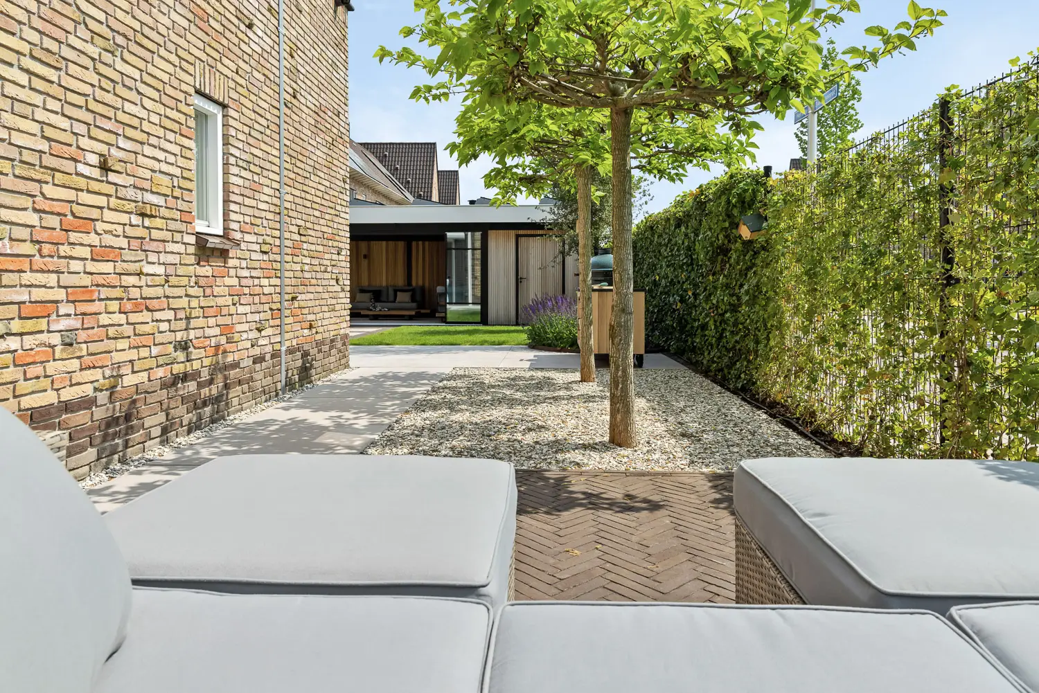In deze luxe wellness tuin is comfort en beleving tot in elk detail uitgewerkt. Midden in de buitenruimte bevindt zich een complete lounge tuin waarin uitnodigende zitgedeeltes en losse zitjes zorgen voor een relaxte sfeer.