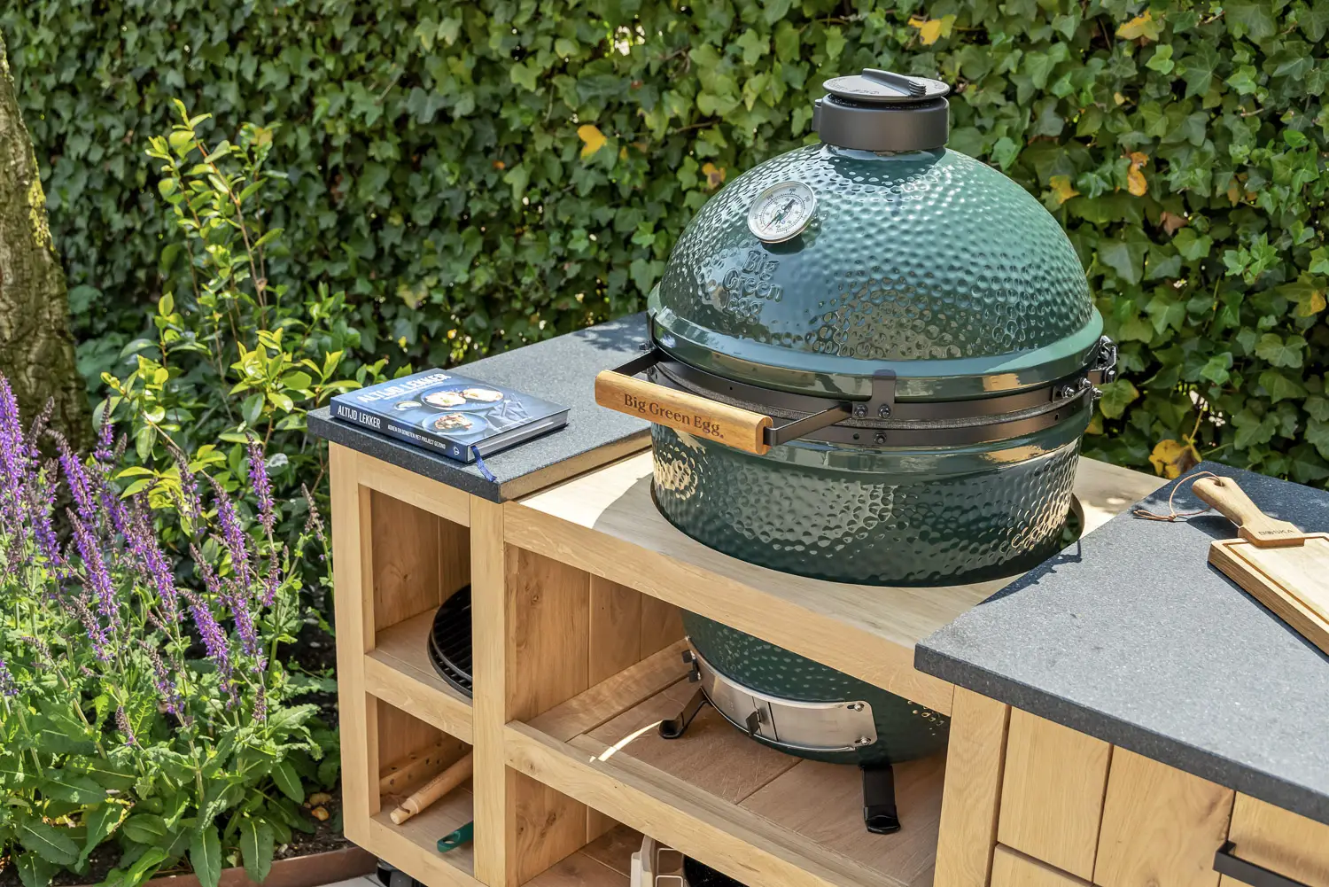 Welnesstuin met overkapping en buitenkeuken met Green-Egg