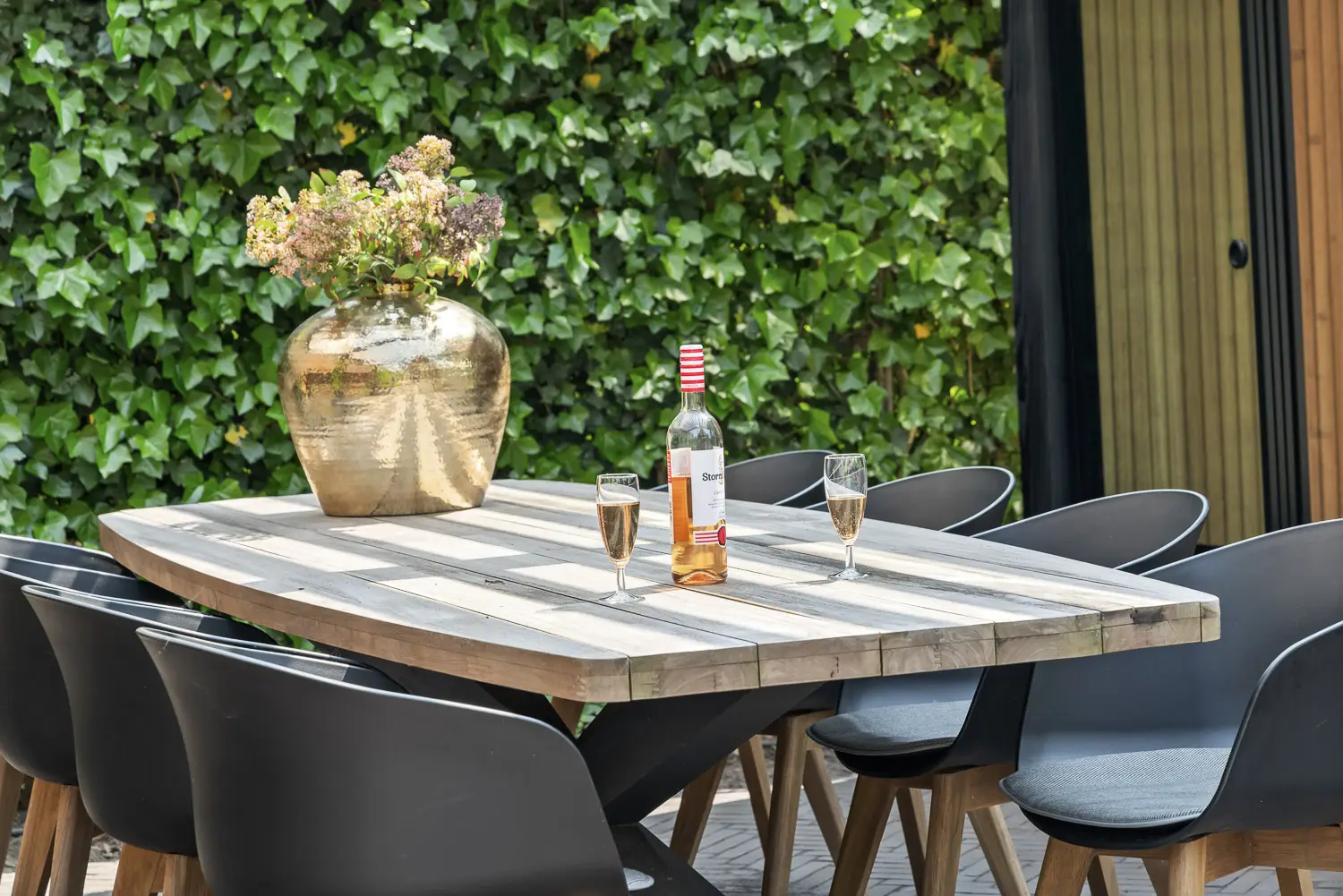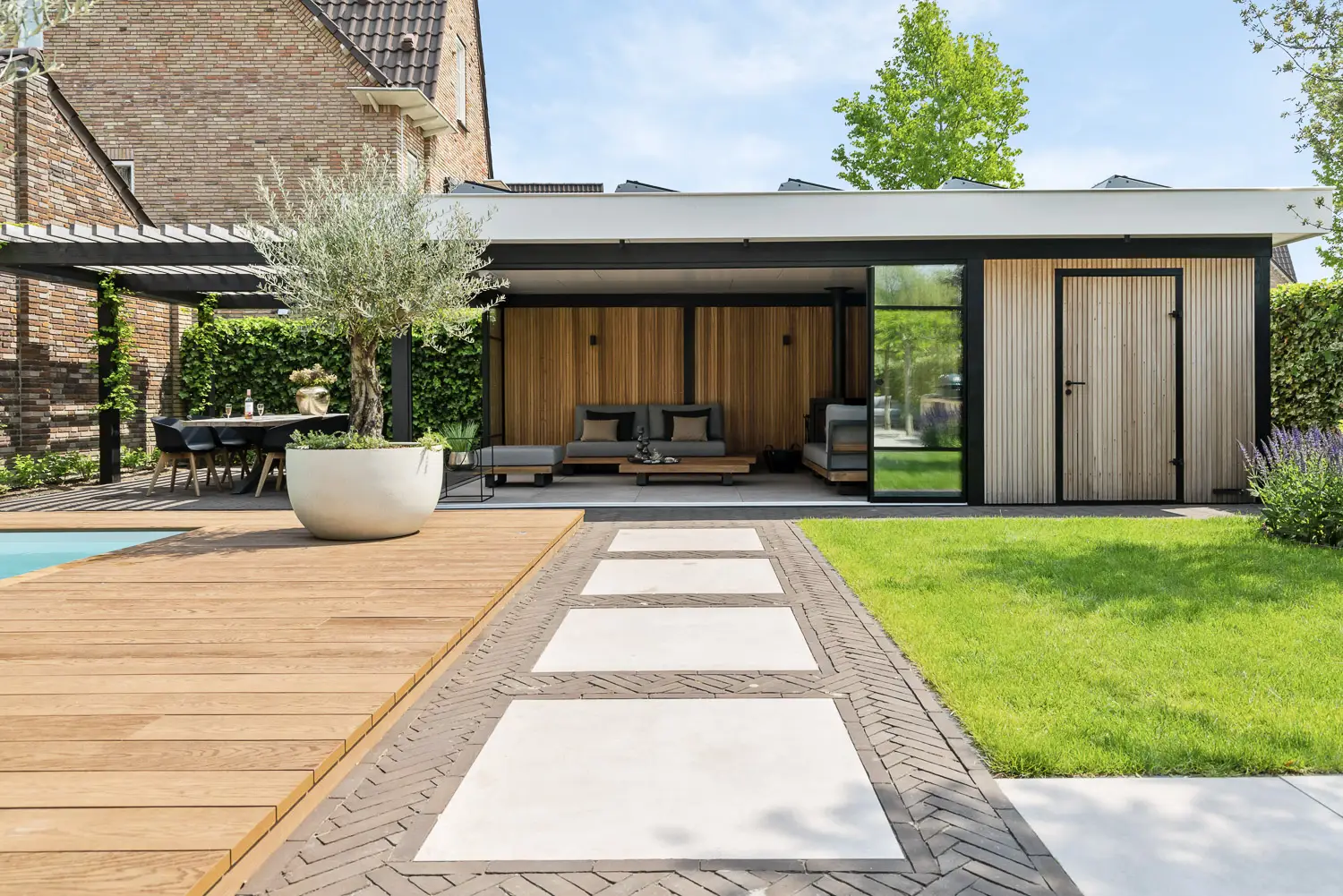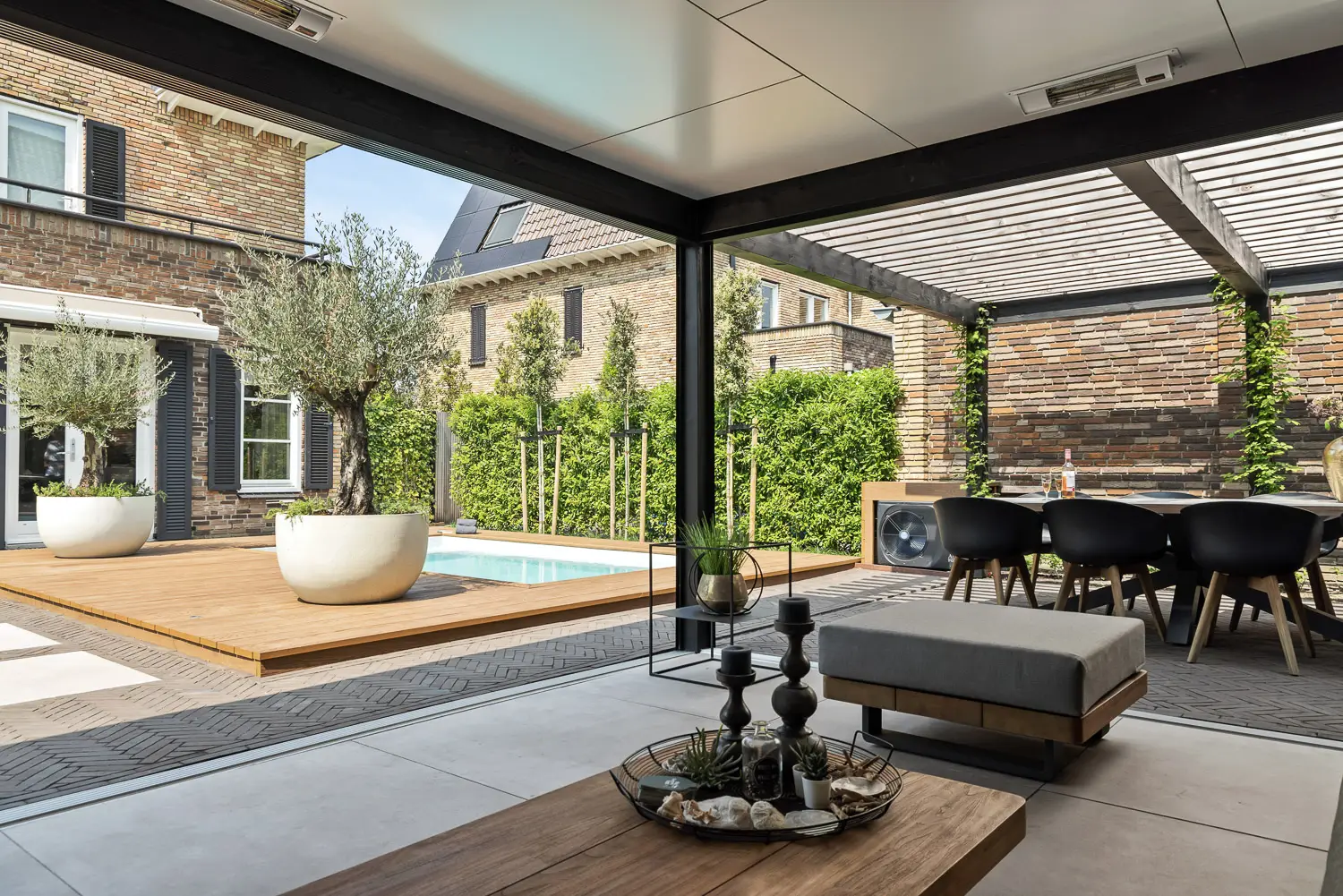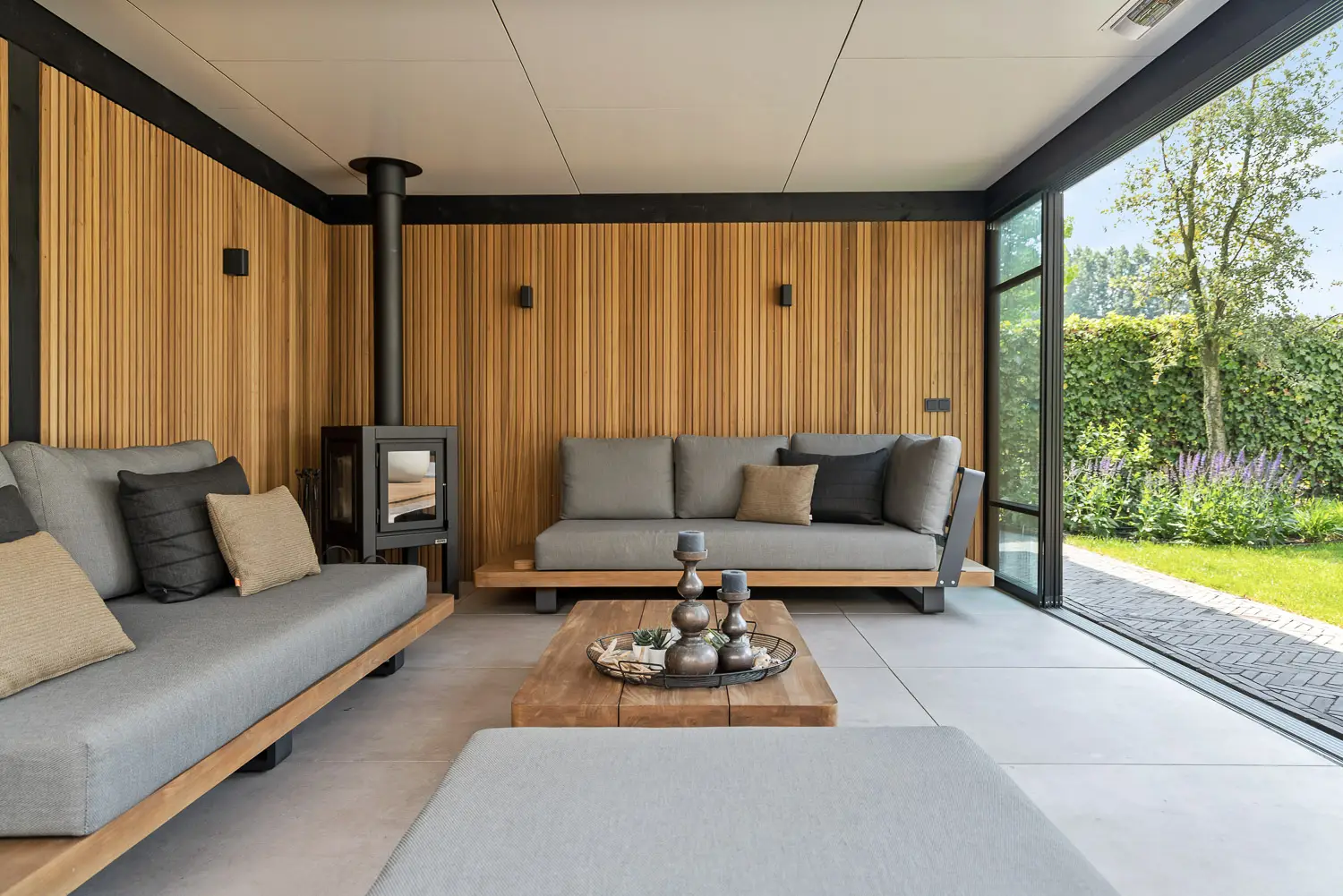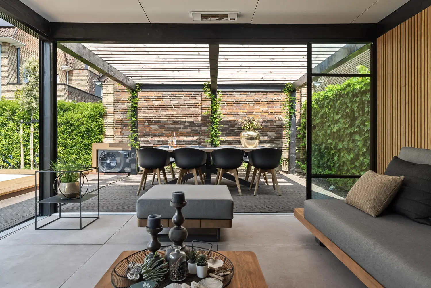 Centraal staat de maatwerk tuinkamer met glazenschuifwanden, die zowel open als afgesloten gebruikt kan worden – ideaal om het hele jaar door te genieten, ongeacht het weer.