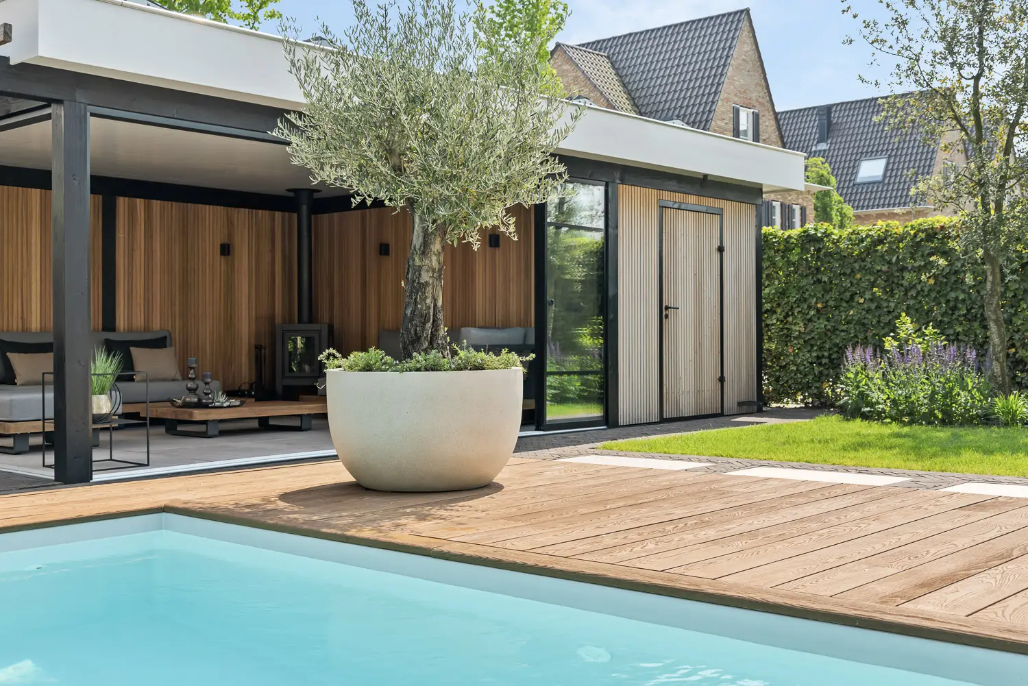 Architectonisch is de tuinkamer uitgevoerd met een Rhombus profiel, dat zorgt voor een strak én natuurlijk uiterlijk. Daarbovenop is gekozen voor een groen sedumdak, gecombineerd met zonnepanelen, waardoor esthetiek en duurzaamheid hand in hand gaan. De aanblik wordt verder verrijkt door mooie accenten: dubbele poort in stijl, kantopsluiting van cortenstaal (Adezz), hoge sierplanten in Adezz aluminium plantenbakken, en karaktervolle bomen zoals olijven, kurkeiken (van BoomNL) en moerbeibomen die verplant zijn om meteen volwassen te ogen.