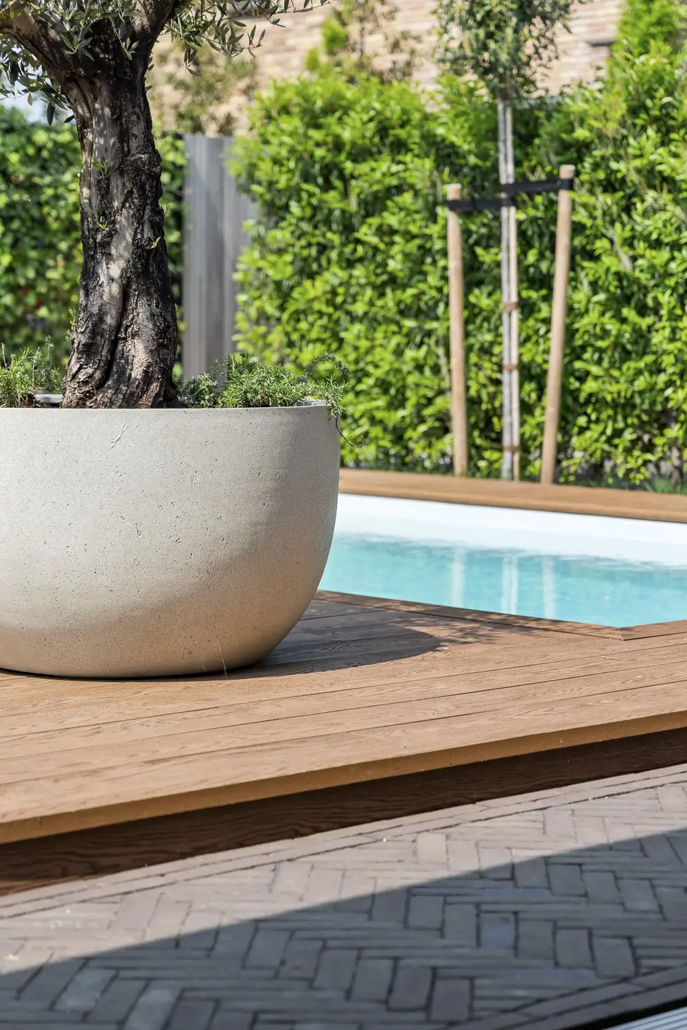 's Avonds komt de tuin tot leven door subtiele Inlite verlichting die paden, zitruimtes en verdeliggingsaccenten sfeervol uitlicht. Tot slot geven stijlvolle accessoires zoals Luca Livestyle potten de tuin een persoonlijke finishing touch. Alles samen vormt dit een rustieke maar verfijnde wellness tuin waar elk element – van structuur, materiaal, beplanting tot gebruik – bijdraagt aan ontspanning, luxe én duurzaamheid.
